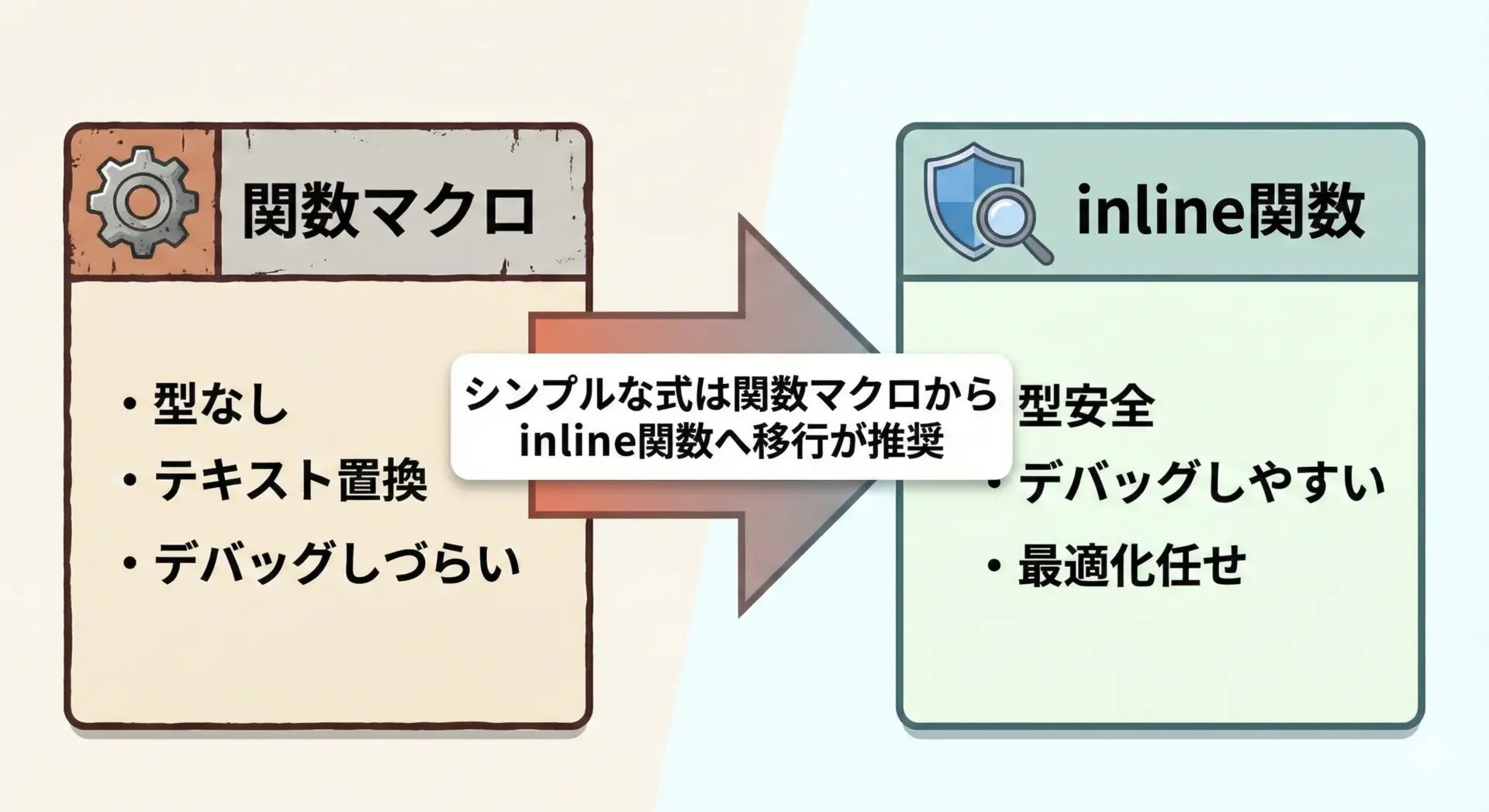 そのため、新しくコードを書く場合は、関数マクロよりもinline関数を優先し、どうしてもプリプロセッサレベルの仕組みが必要な場合だけマクロを使うという設計が推奨されます。