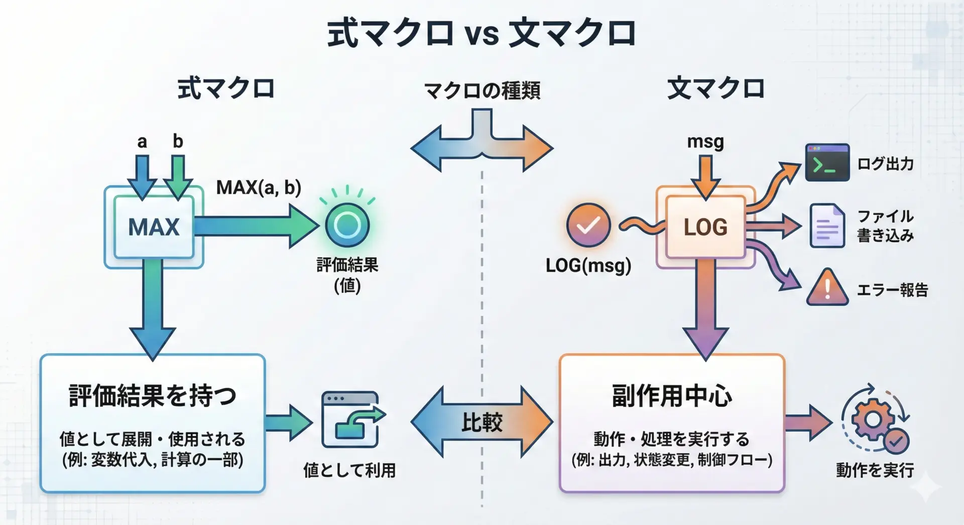 関数マクロを設計する際の重要なポイントは、「副作用の有無」と「戻り値のように使うかどうか」を明確にすることです。