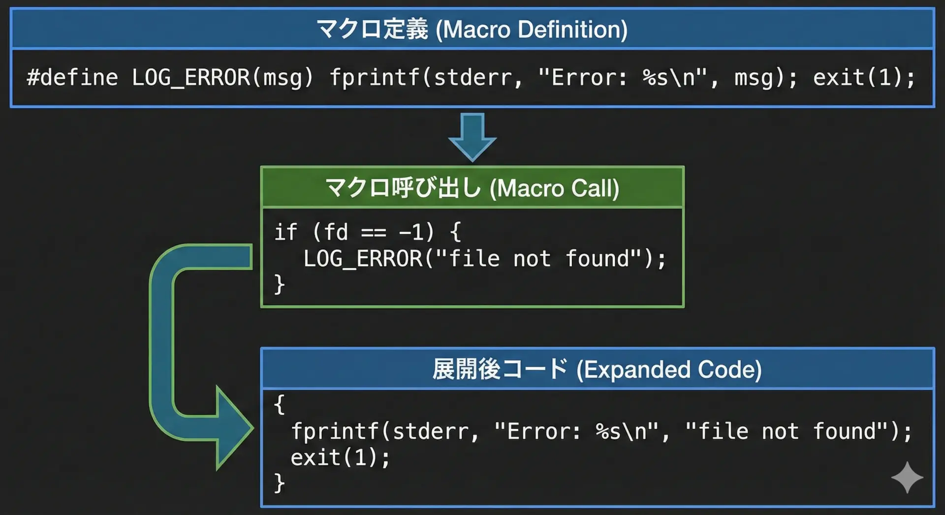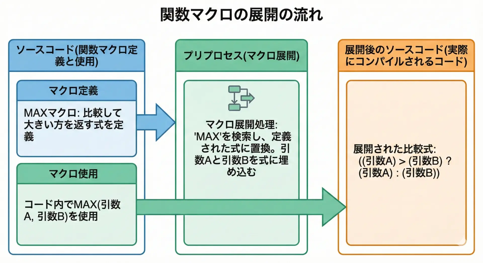 関数マクロとは、C言語のプリプロセッサ機能である#defineを使って、関数のように引数を取るマクロのことです。