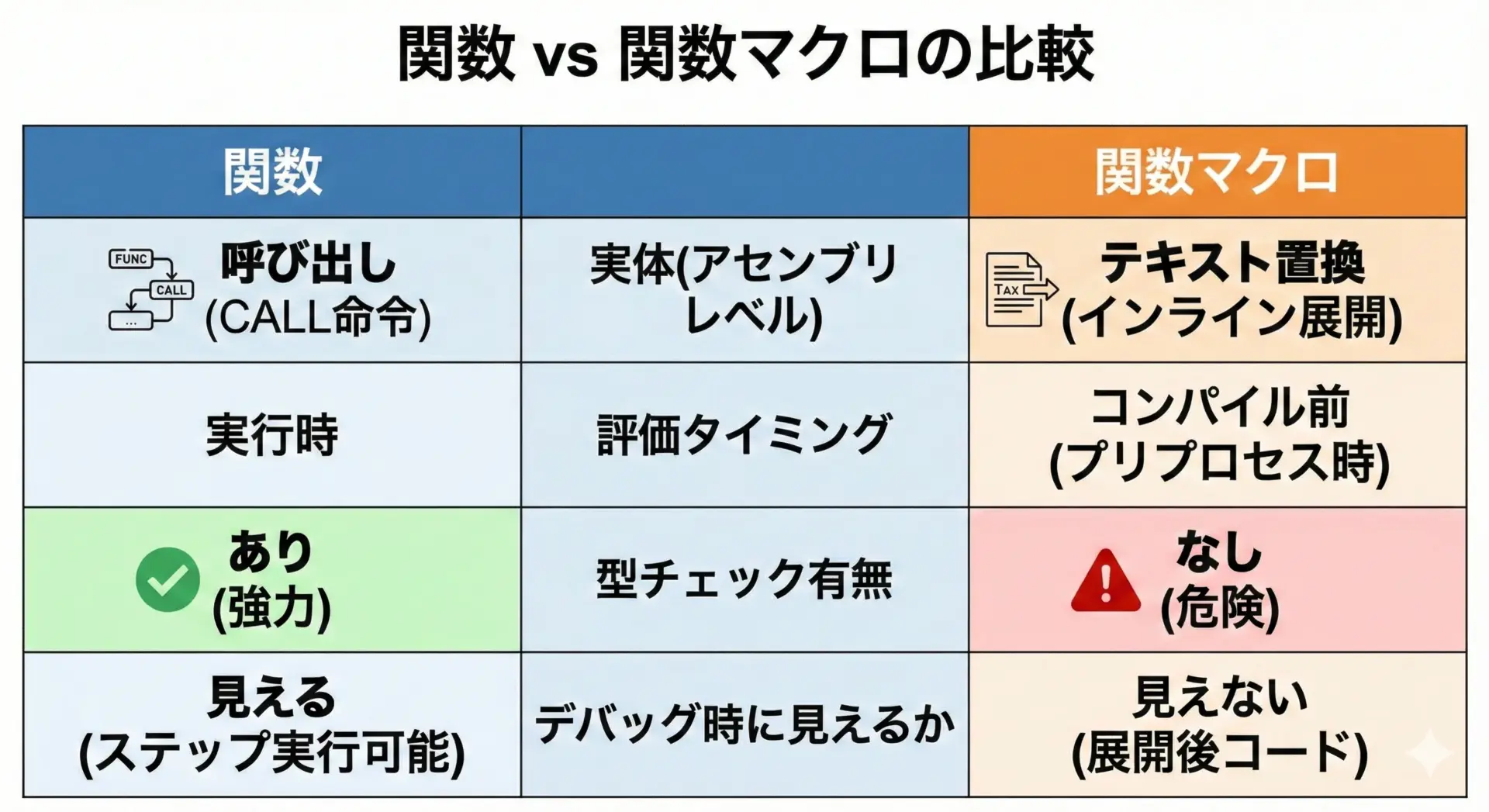 通常のC言語の関数と関数マクロには、次のような違いがあります。