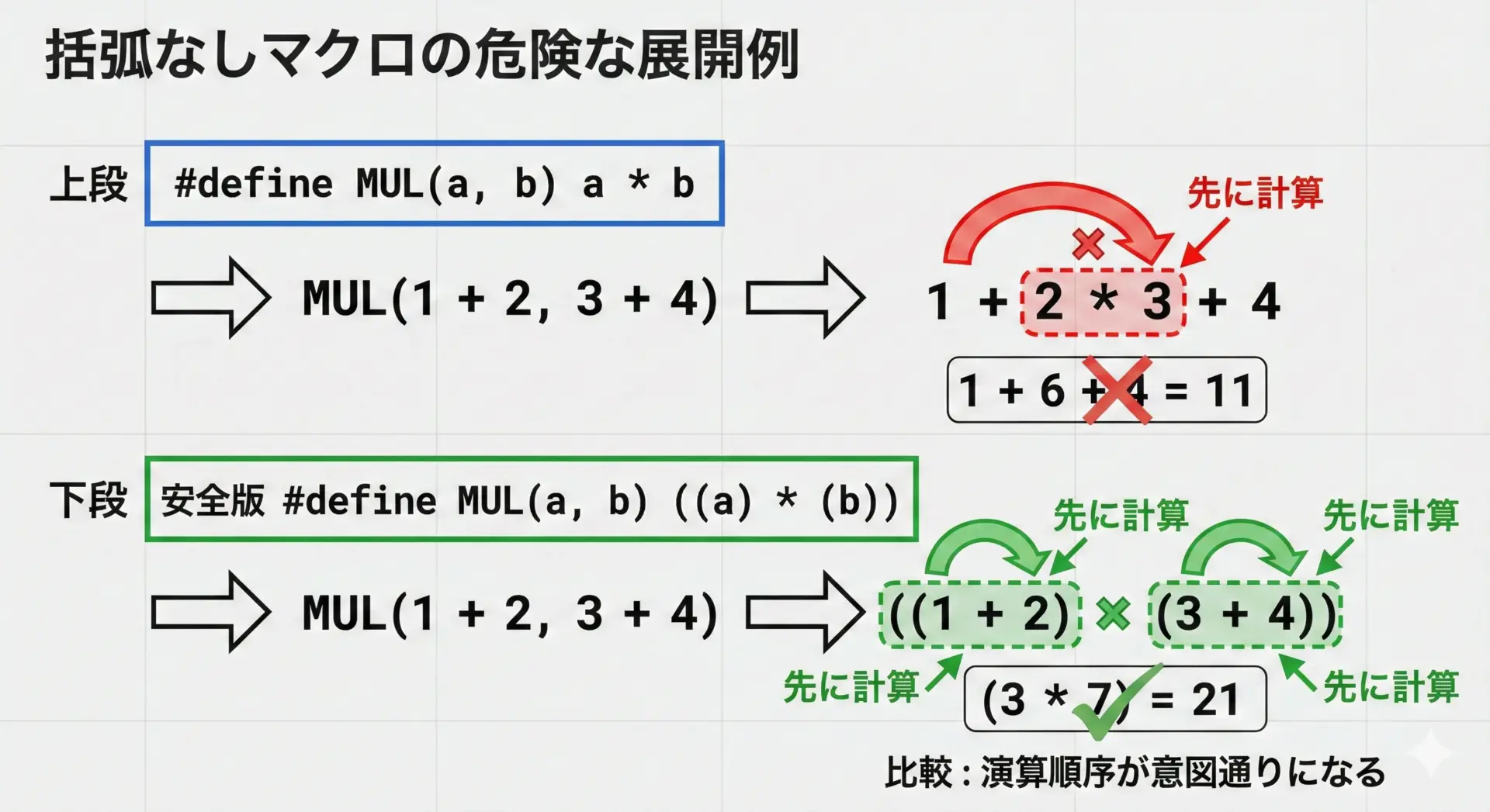 安全な関数マクロを書くうえで、「引数にも展開結果にも括弧を徹底的に付ける」ことが非常に重要です。