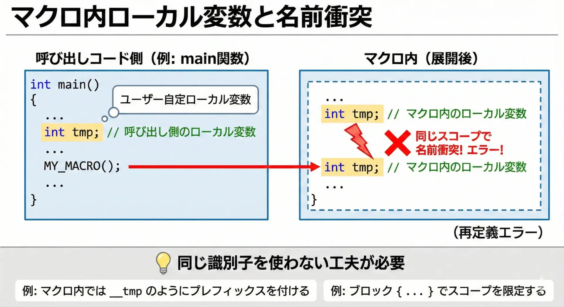 // 悪い例: マクロ内の変数名が衝突する可能性がある
