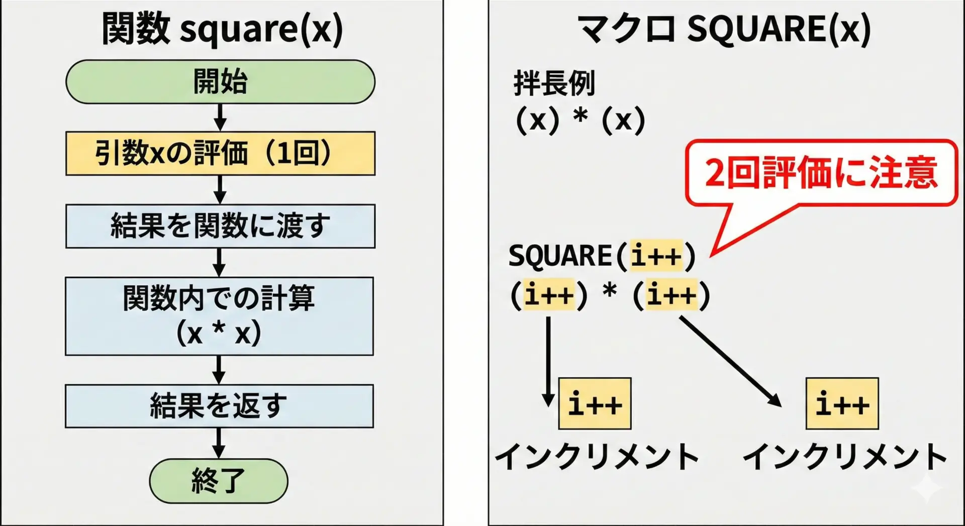 そのため、副作用(インクリメント、代入、関数呼び出しなど)を含む式をマクロ引数に渡さないことが重要です。