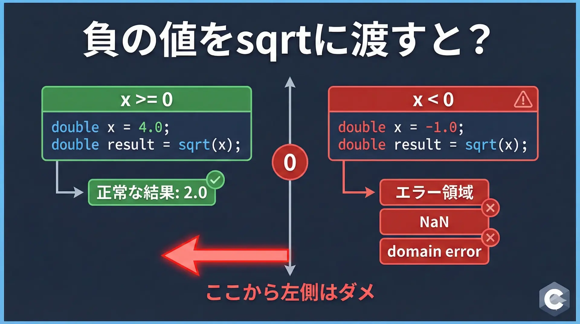 一方で、整数との型変換や浮動小数点誤差、負数入力時のNaN・errnoの扱い、C89/C99間の仕様差など、押さえておくべきポイントも多く存在します。
