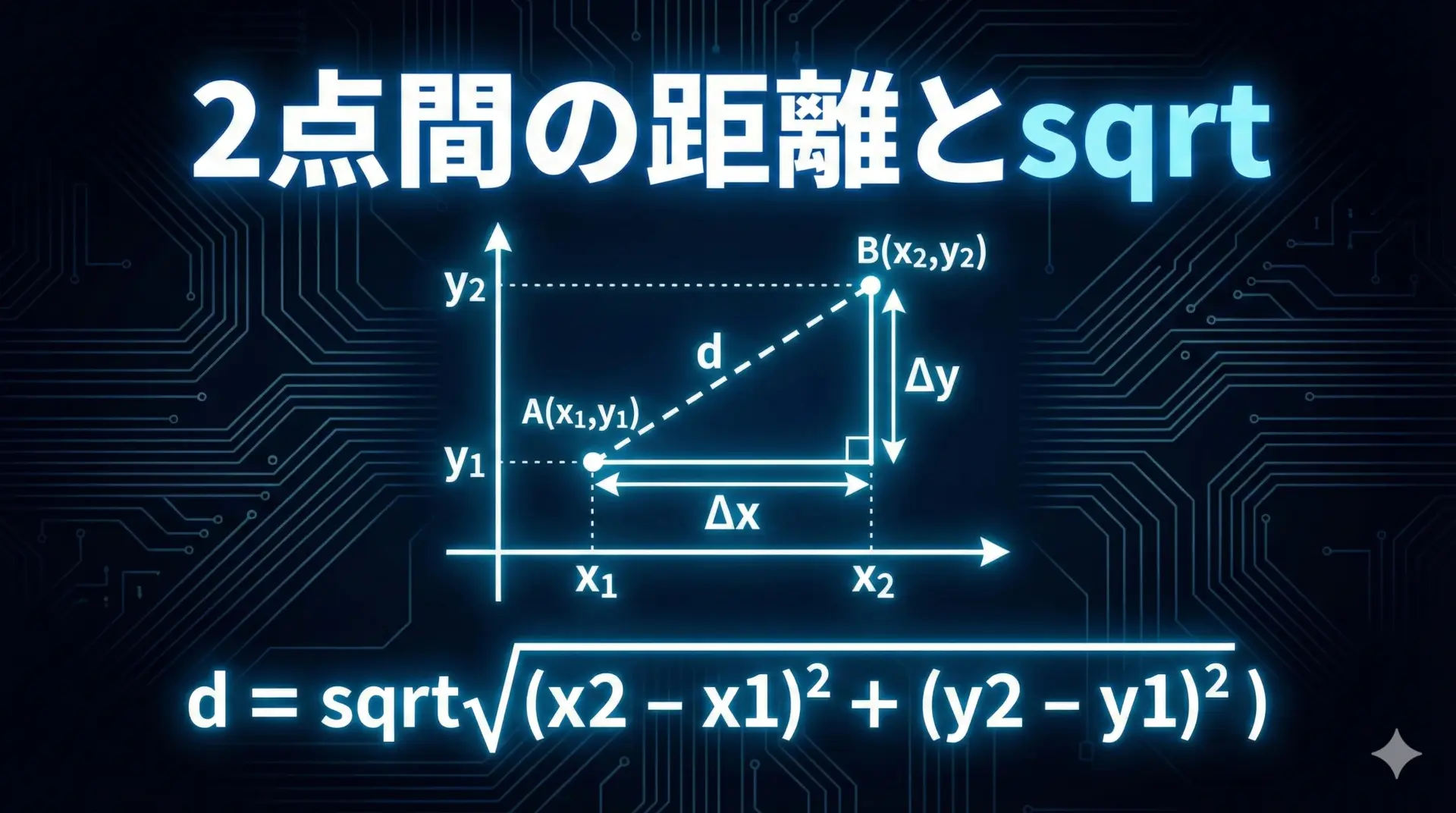sqrtの代表的な活用例として、2次元平面上の2点間の距離を求める問題を考えてみます。