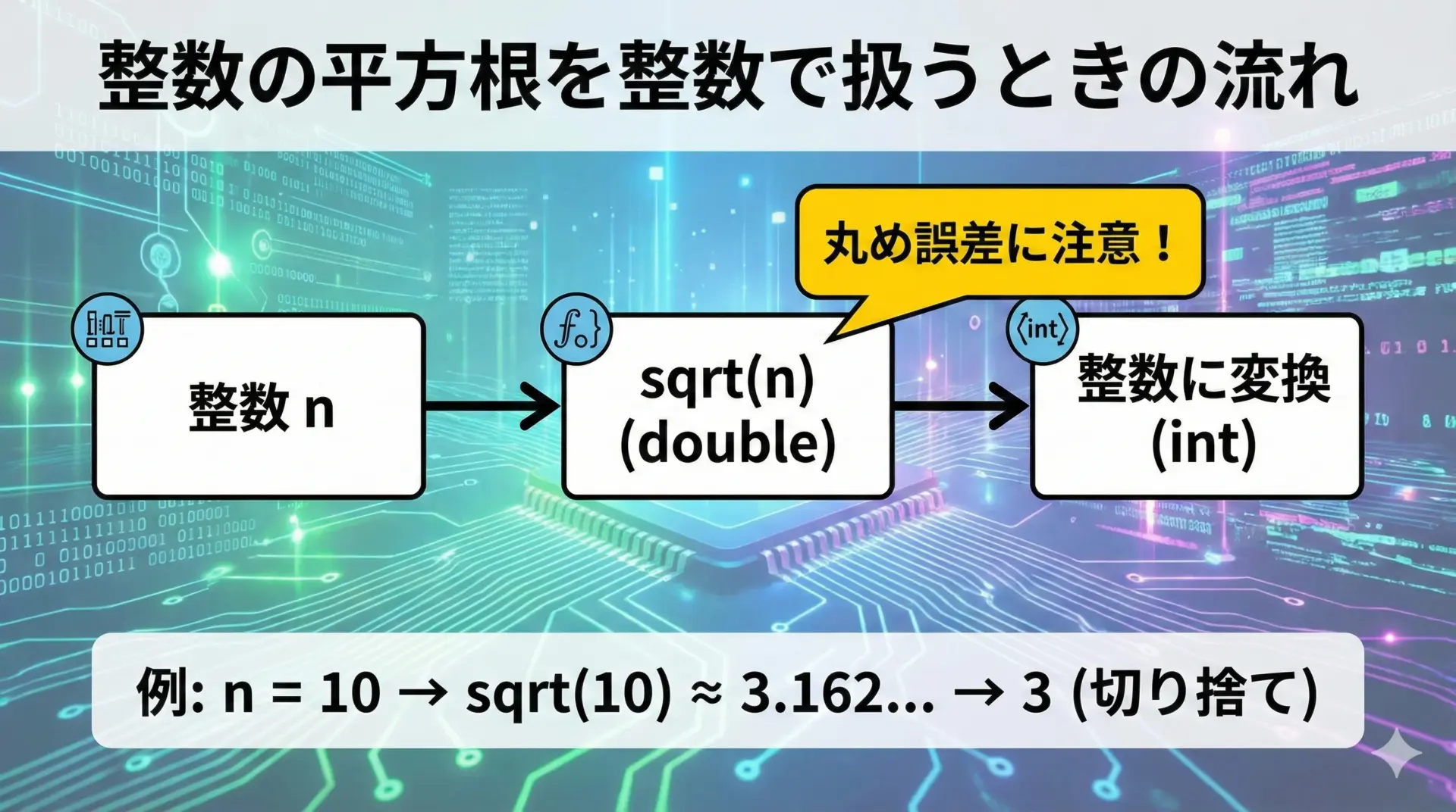 1. sqrtは整数ではなく実数(double)を返す 2. 整数として扱いたい場合はキャストや丸め処理が必要 3. 2乗して元に戻るとは限らない(丸め誤差のため)