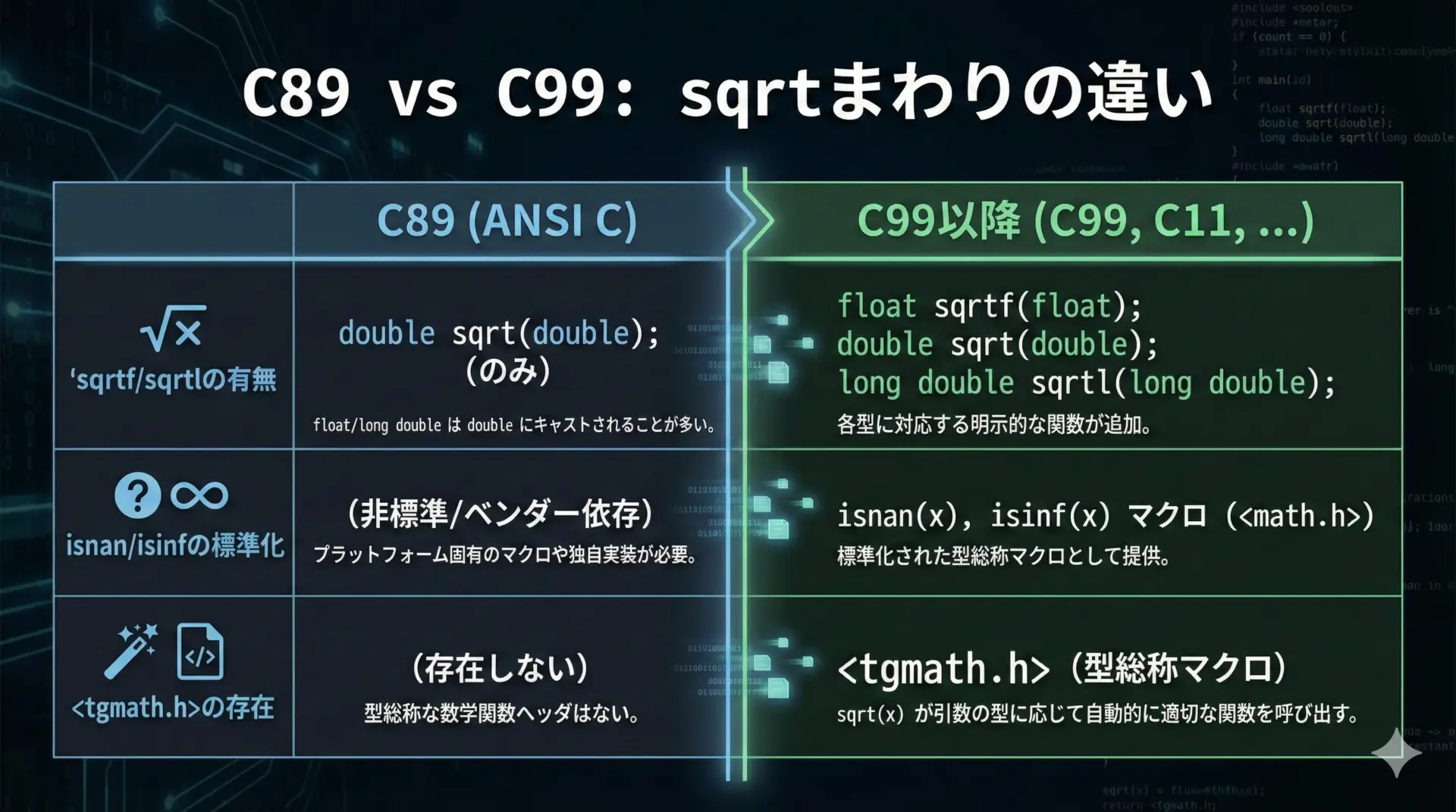 このため、「C89互換性が必要なコード」ではsqrtfやsqrtl、isnanなどを使うとコンパイルエラーになる可能性があります。