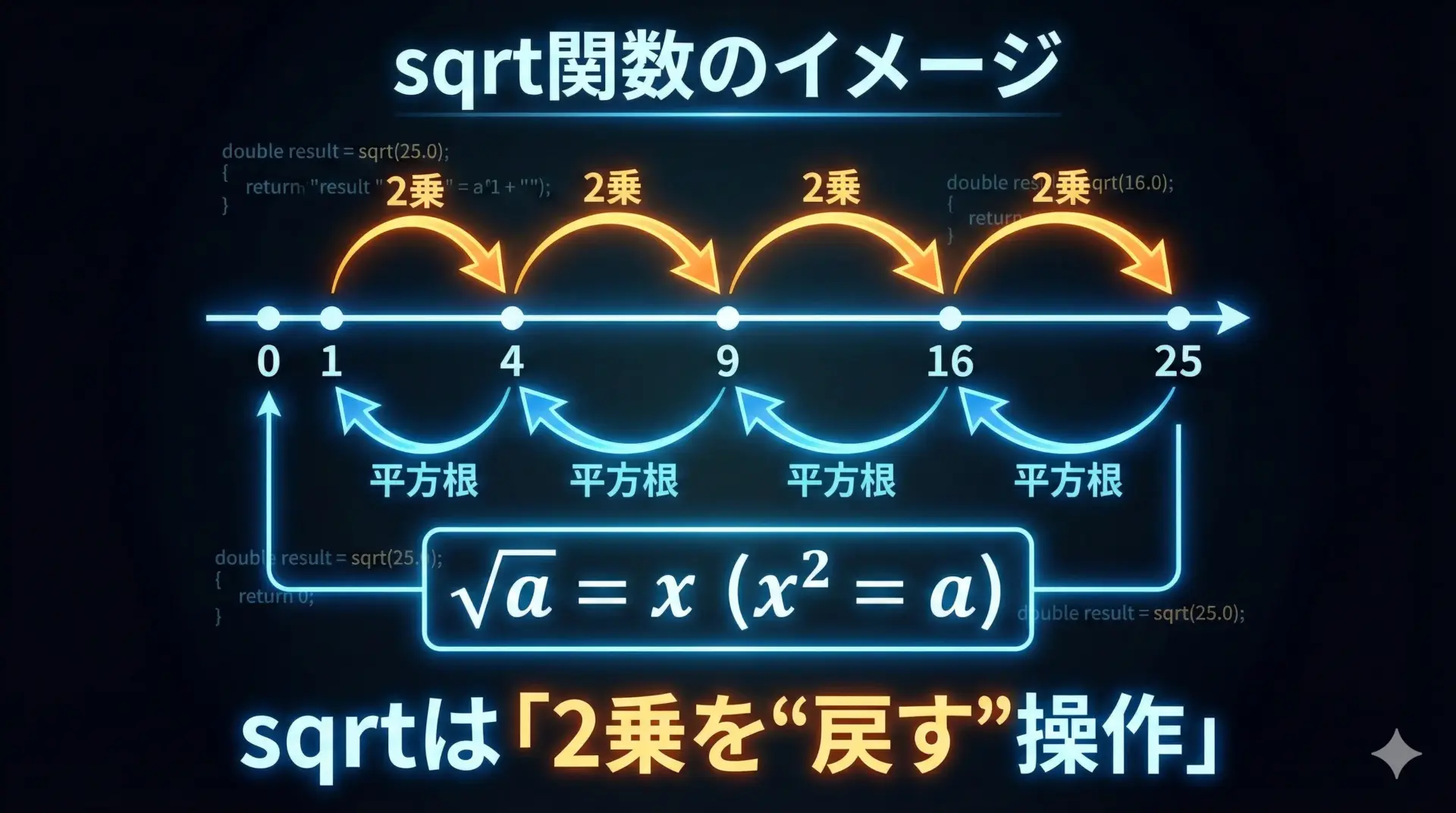例えば、25の平方根は5、2.25の平方根は1.5というように、x * x = aとなるxを返す関数です。