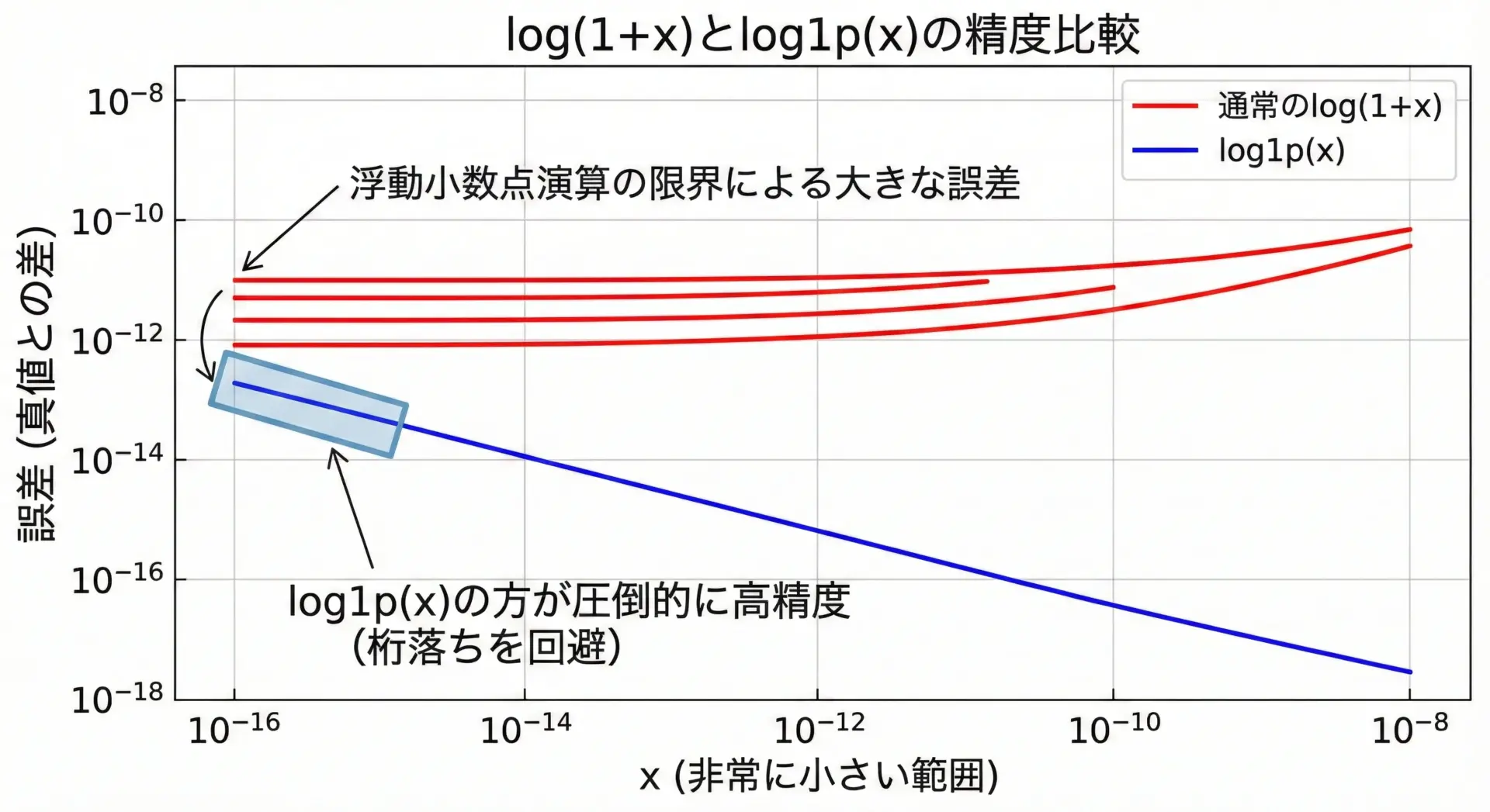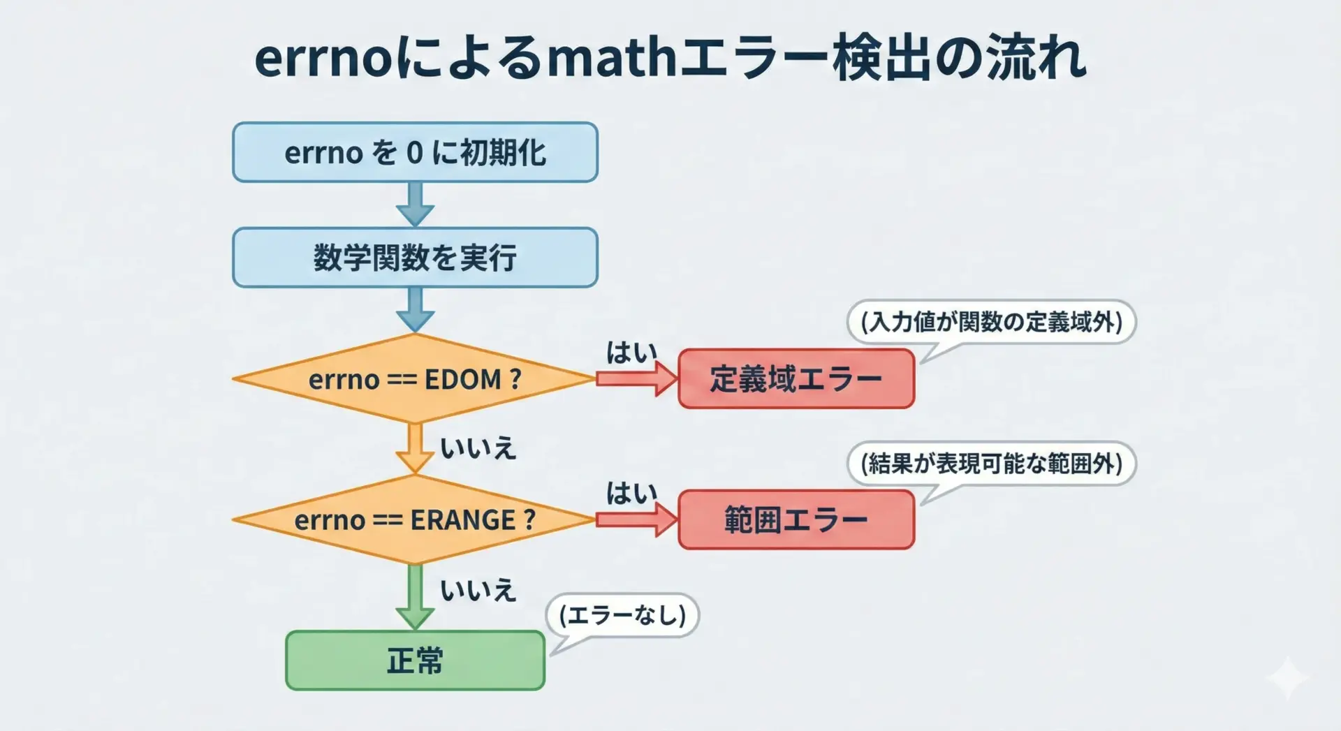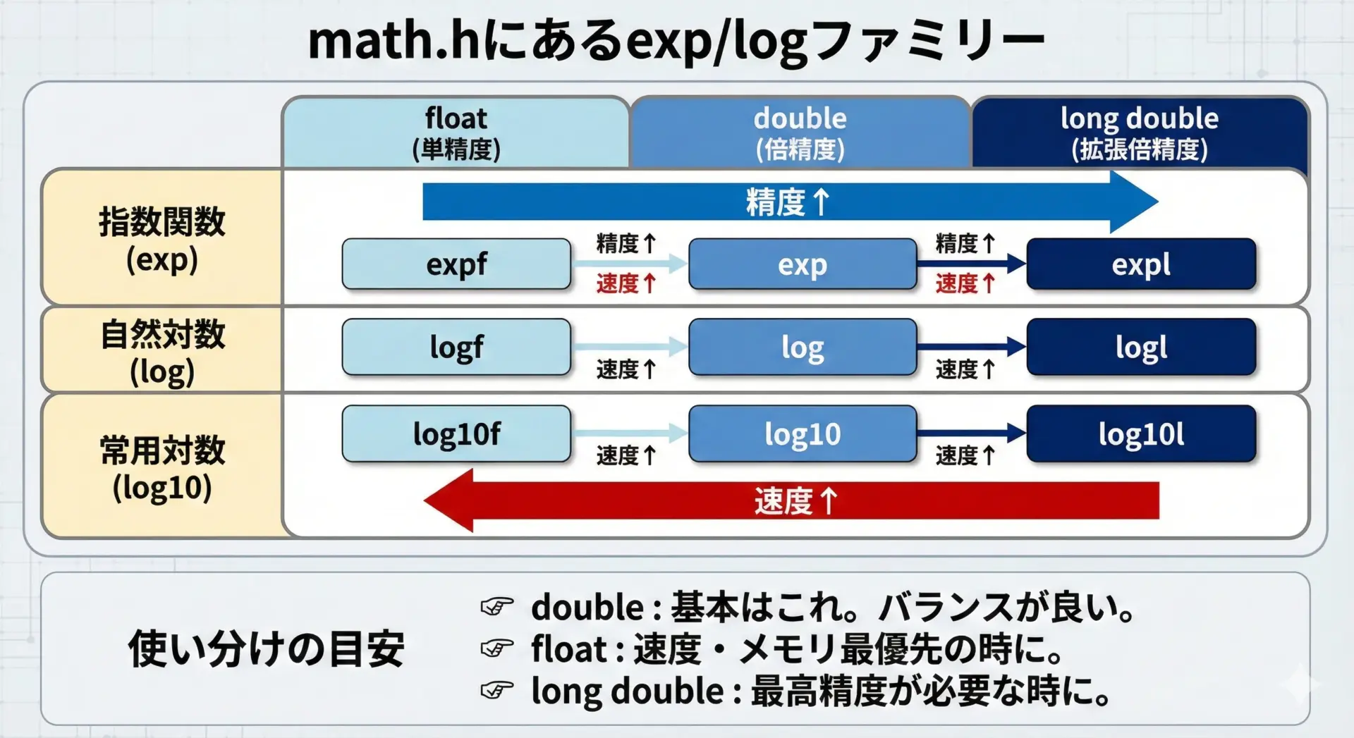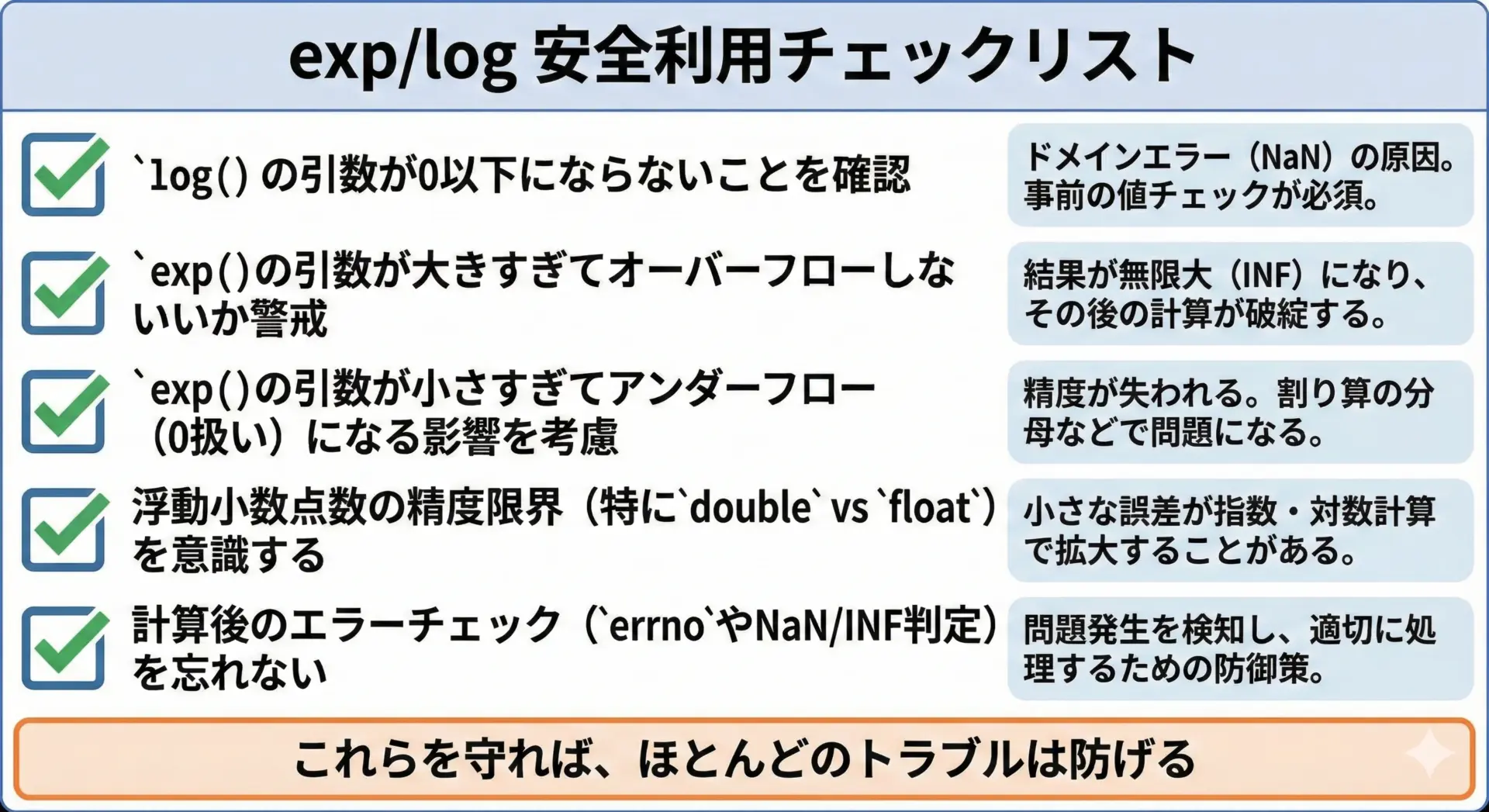 実装では#include <math.h>と適切なリンク(Unix系は-lm、MSVCは不要)を忘れず、対数の入力は必ずx>0を保証することが大切です。