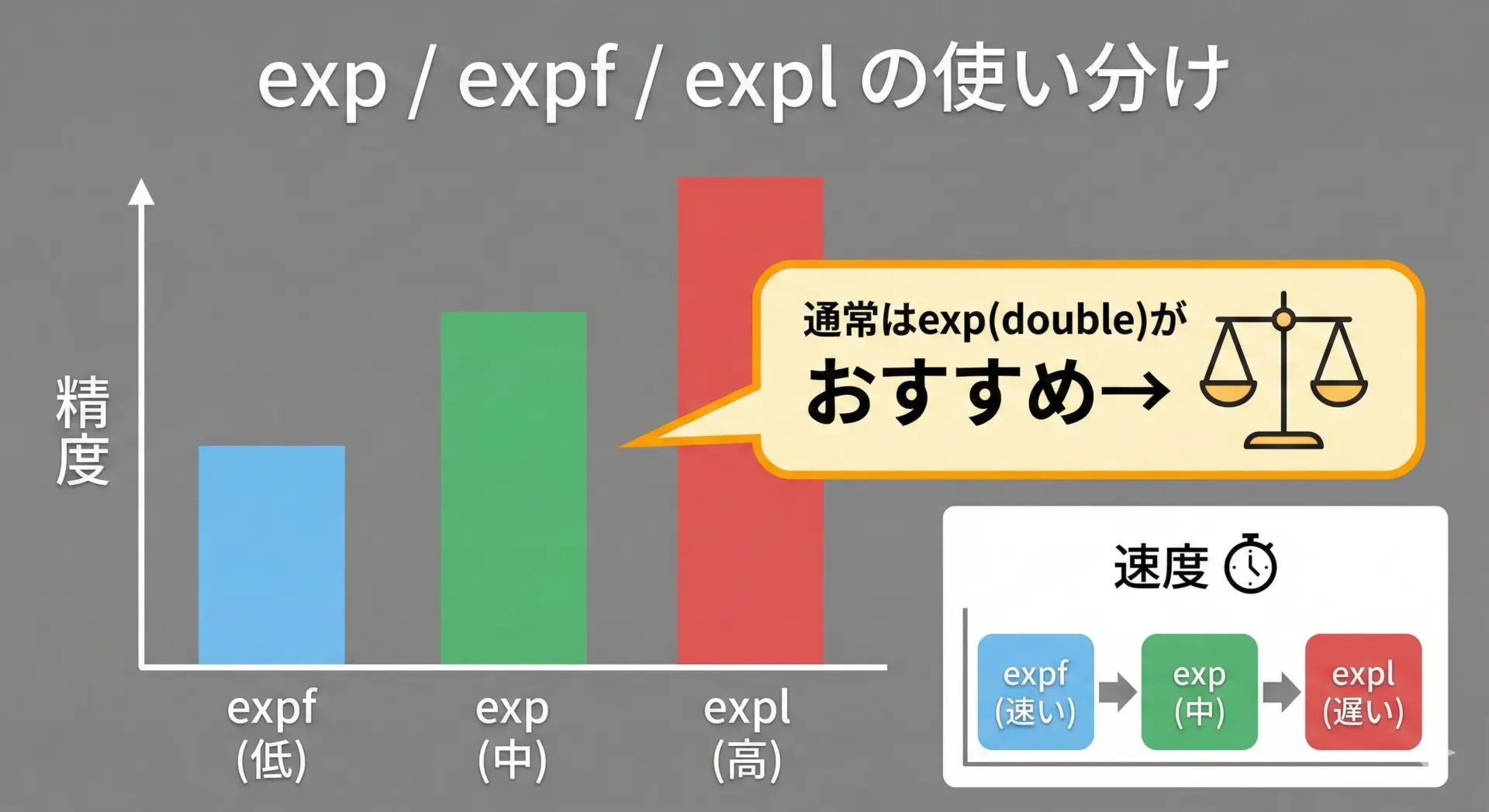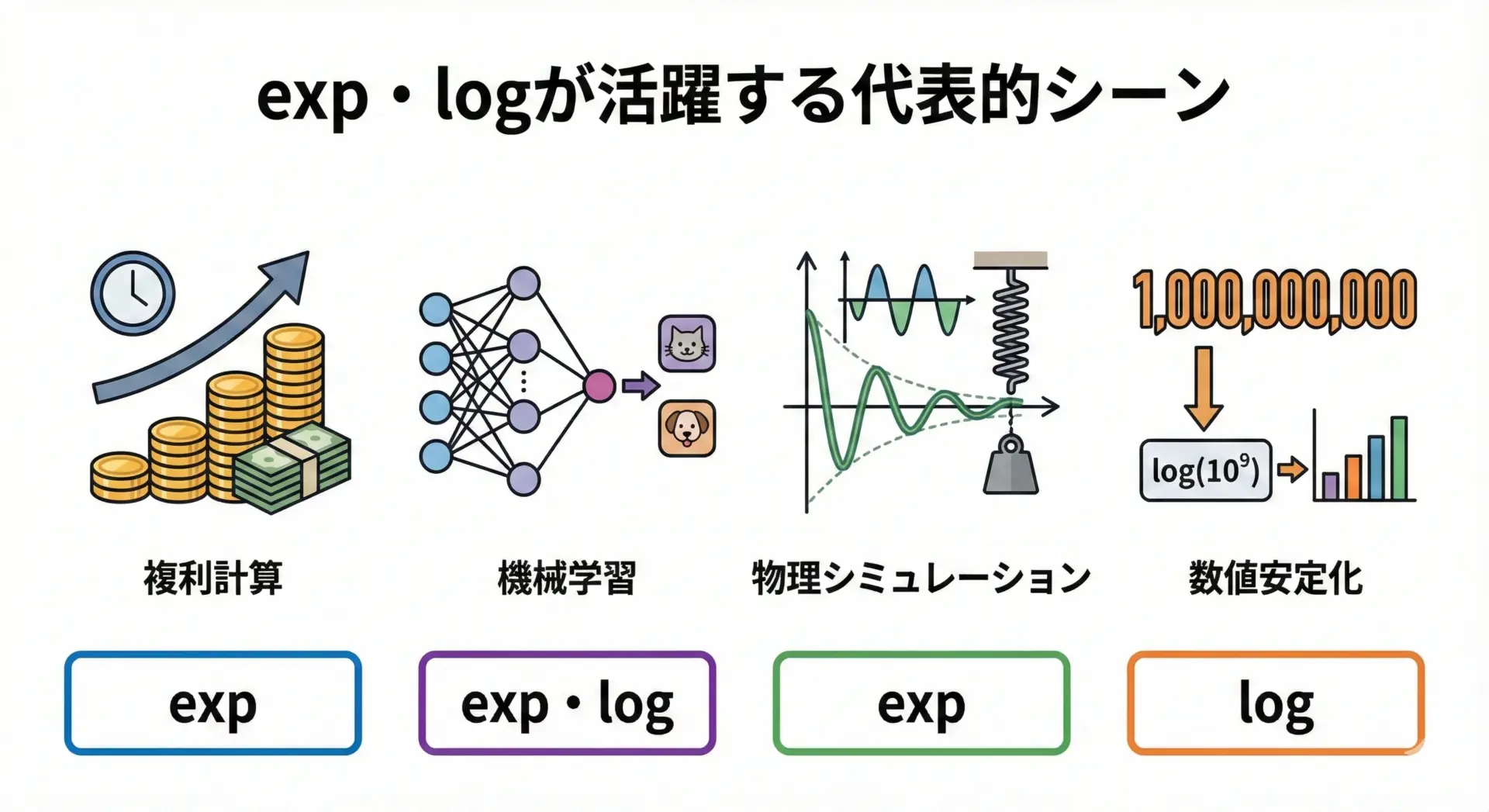| exp(x) | e^x | 入力は任意の実数 | 対数の逆関数、指数成長/減衰のモデル化 |