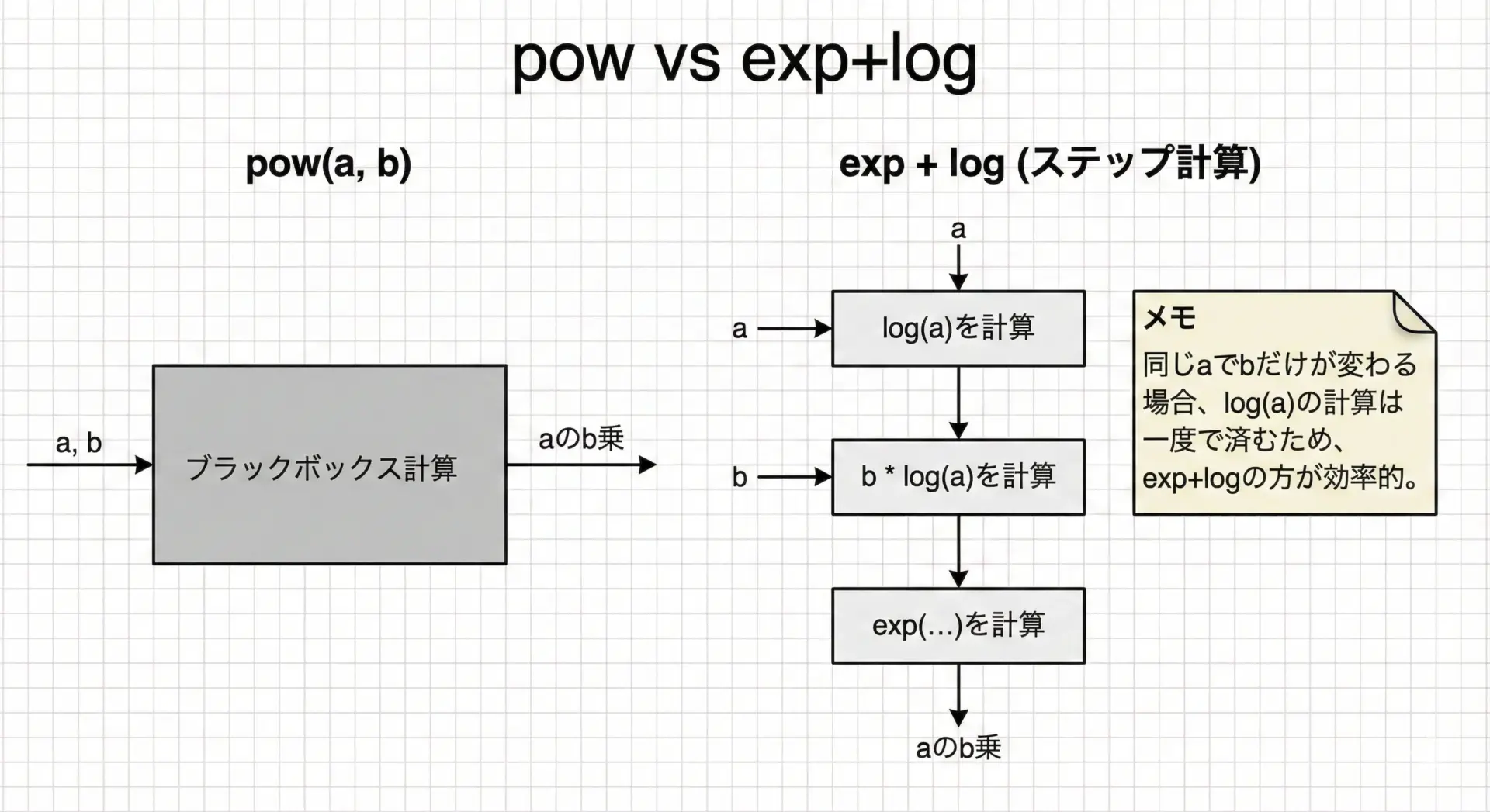 つまり、exp(log(x)) = x(x>0)、log(exp(y)) = yが成り立ちます。