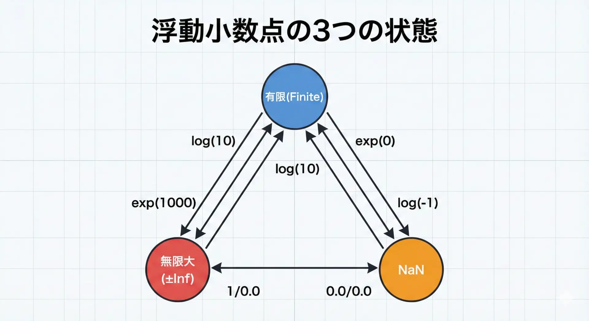 実装ではlog(0.0)は-inf(マイナス無限大)、log(-1.0)はNaNになるのが一般的です。