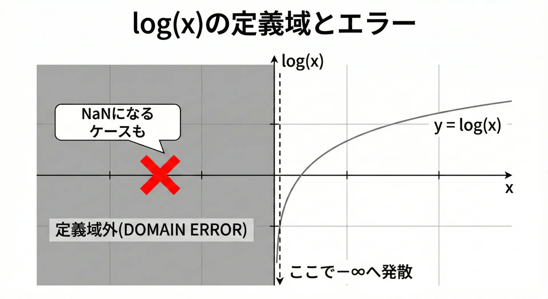 0や負の入力でlogやlog10を呼び出さないように、必ず事前に入力域をチェックしてください。