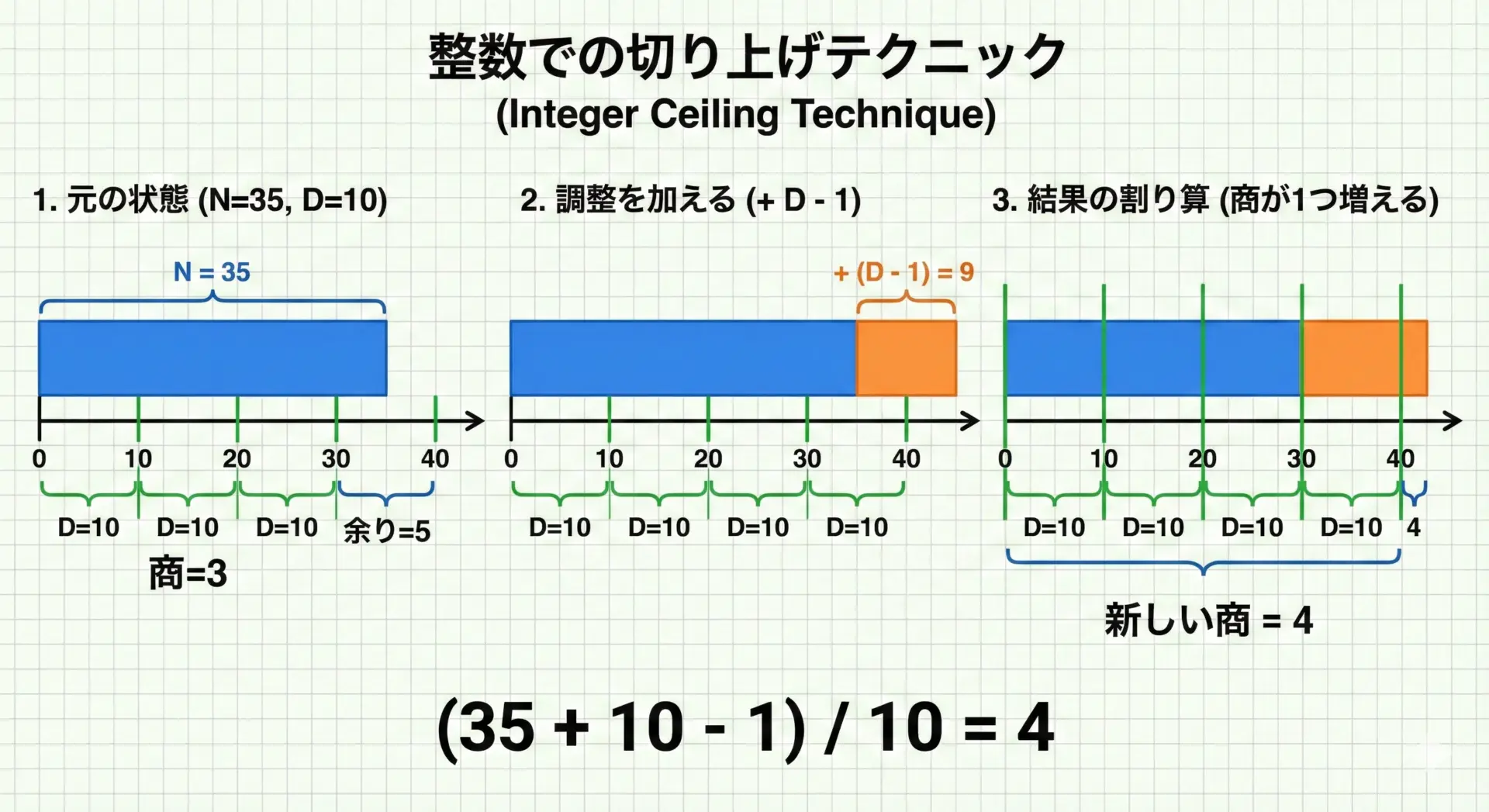 - 「割り切れないときは切り上げたい」(ページ数など) → (a + b – 1) / b などのceil相当式