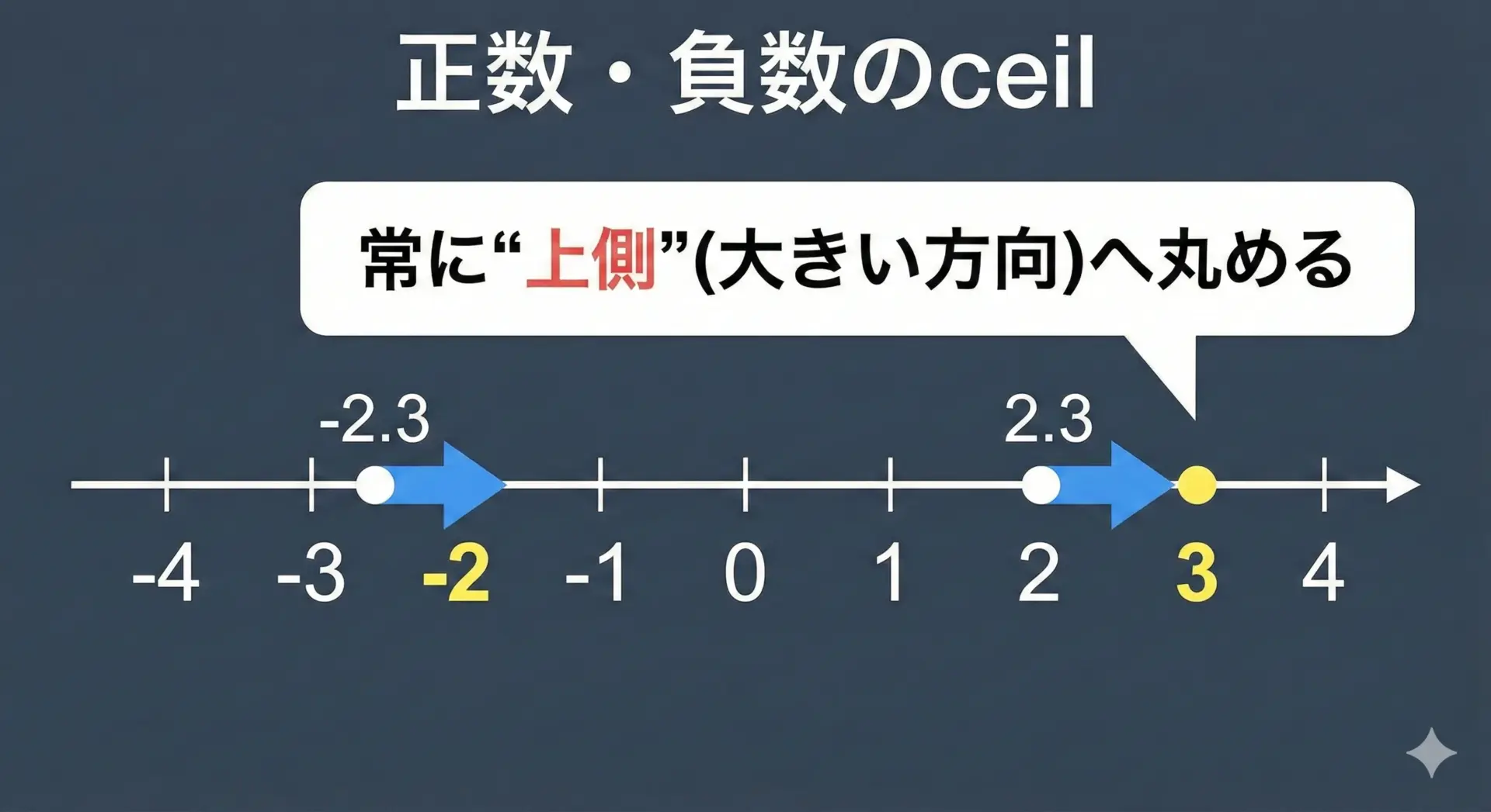 たとえば-2.3の場合、ceilは-2.0(0に近い側)、floorは-3.0(0から遠い側)になります。