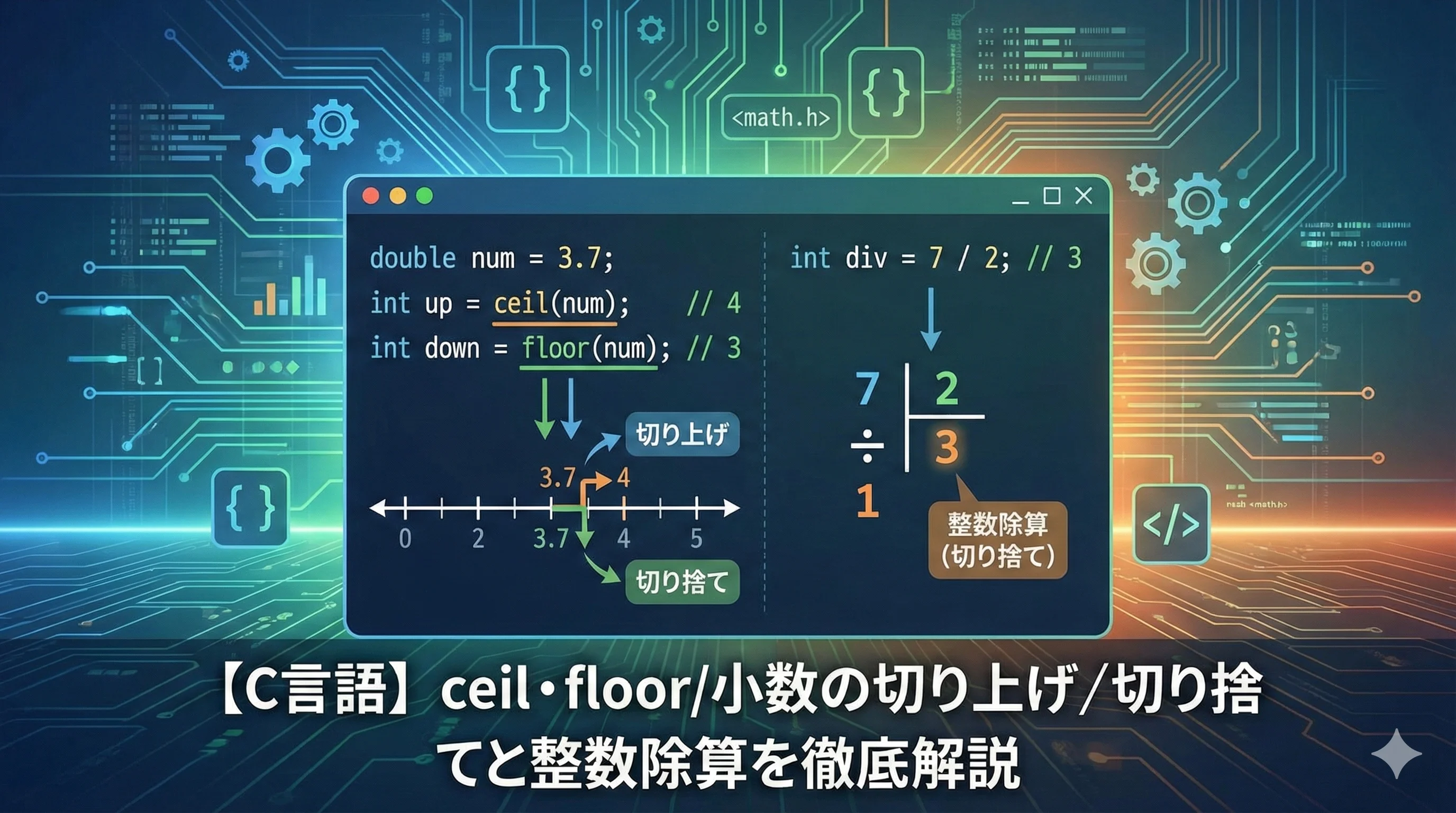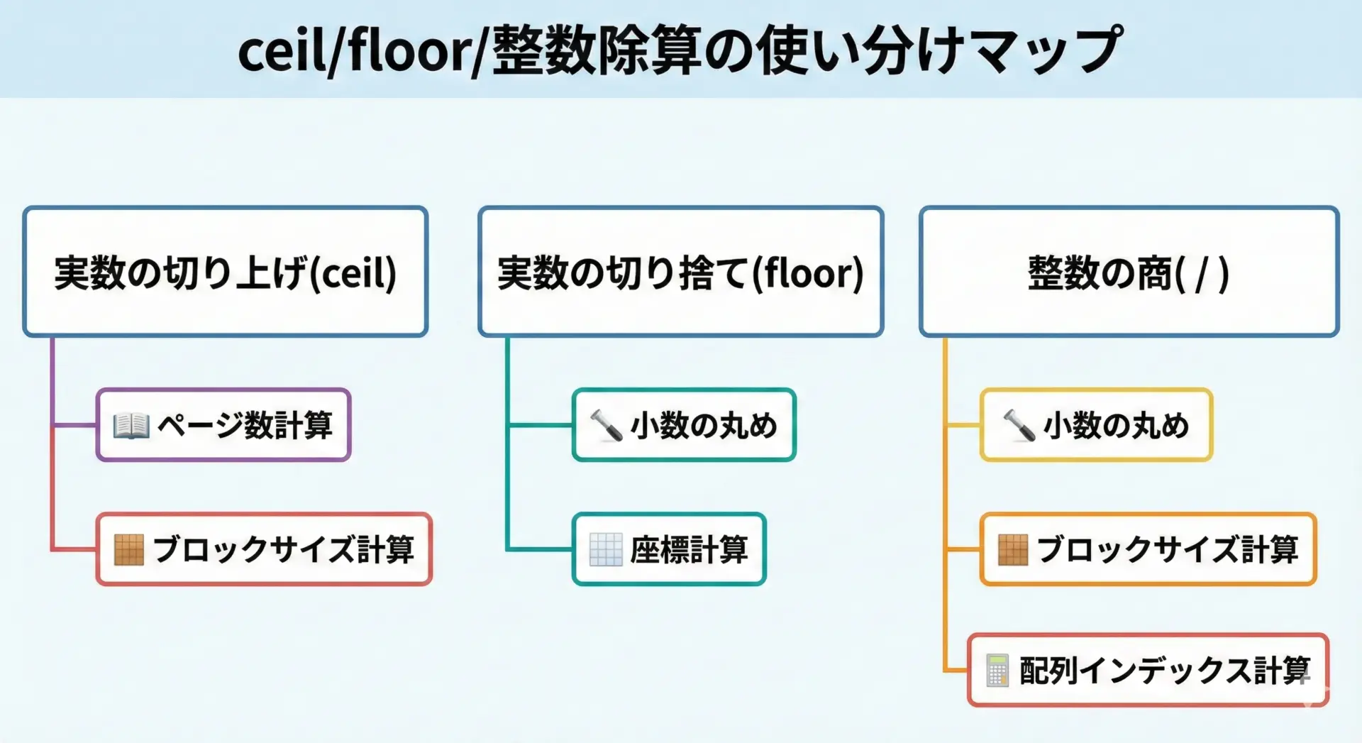 本記事では、ceil・floor関数と整数除算の基本から、実務で役立つ実装パターンまで、図解とコード例を交えて詳しく解説します。