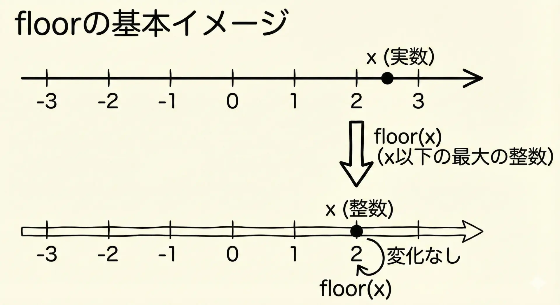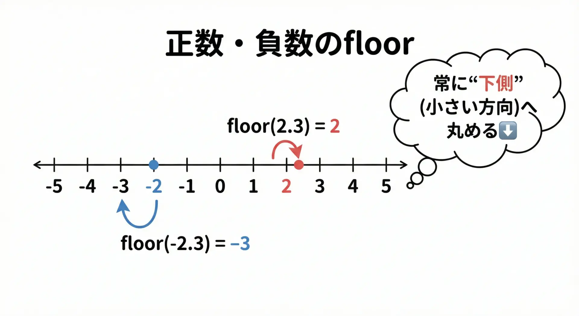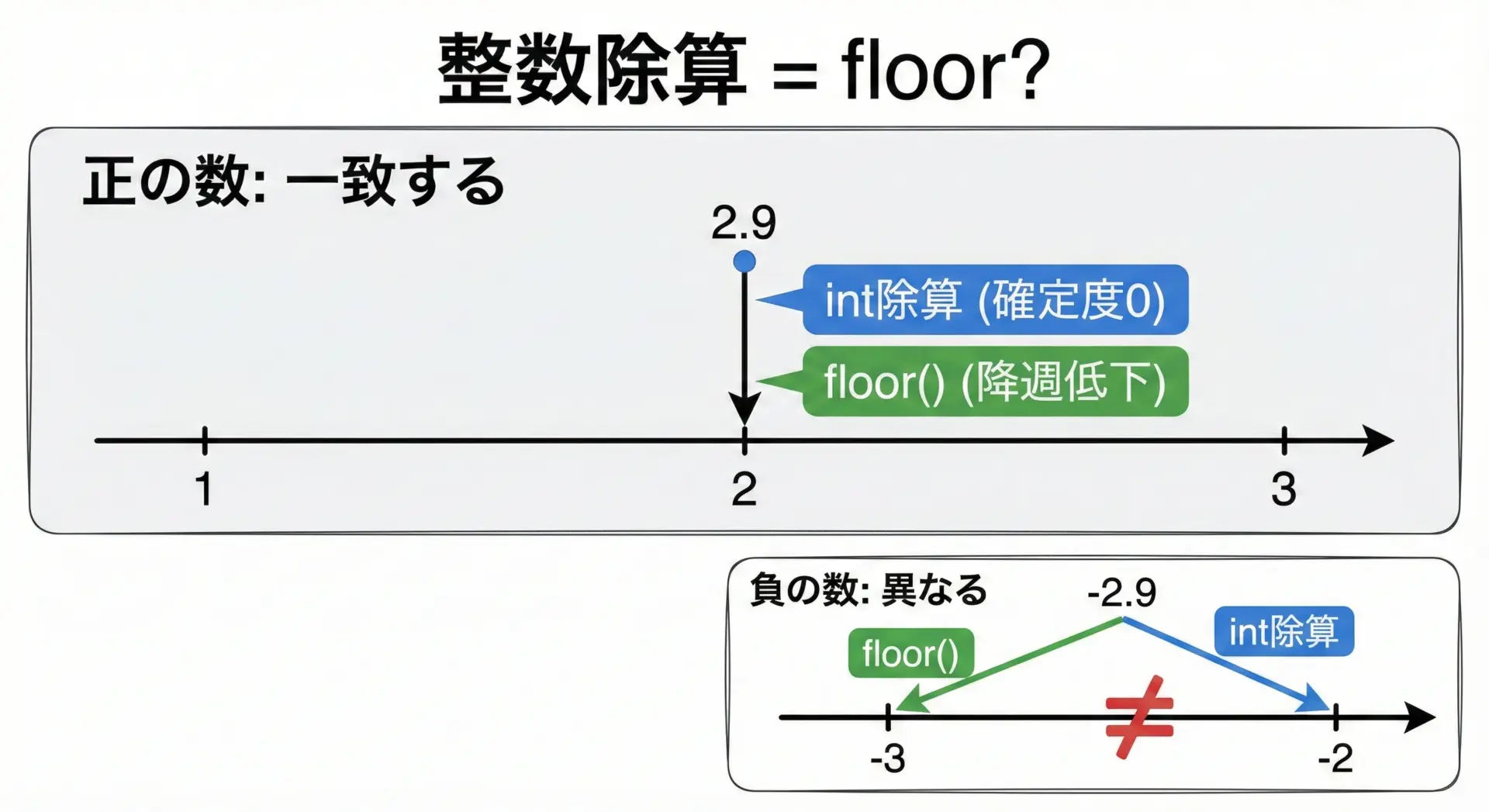 floor(x)は常に小さい側(左側)に丸める(int)xや整数除算a / bは0に向かって丸める- そのため、負の数でfloorと(int)や整数除算の結果は一致しない