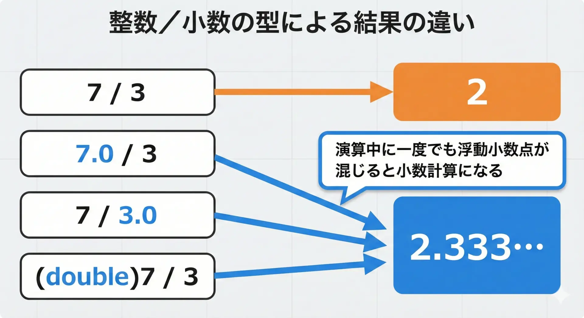 特に、整数同士の割り算が自動的に切り捨てになること、ceil・floorは戻り値がdoubleであること、そして負の数でfloorと(int)の結果が異なる点は、バグを防ぐうえで重要なポイントです。