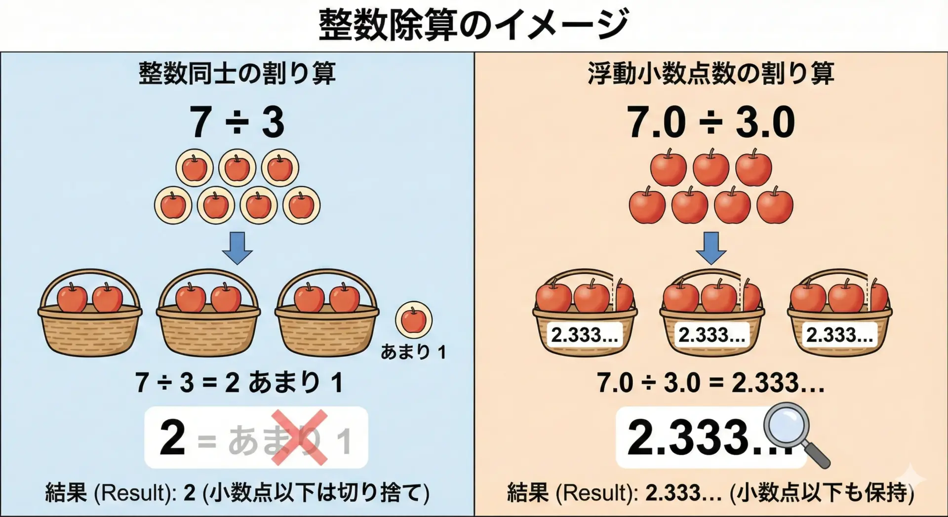 また、整数同士の割り算は、自動的に小数点以下が切り捨てられるため、その挙動を理解していないとバグの原因になります。