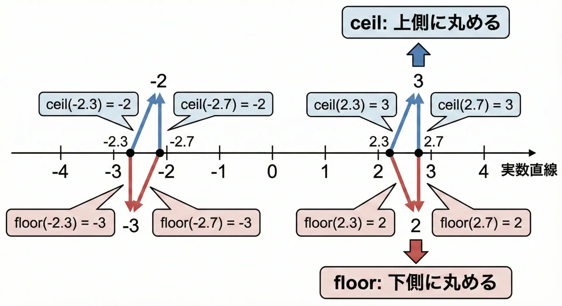 小数点以下を切り上げるイメージです。 - floor(x): 「x以下の最大の整数」を返します