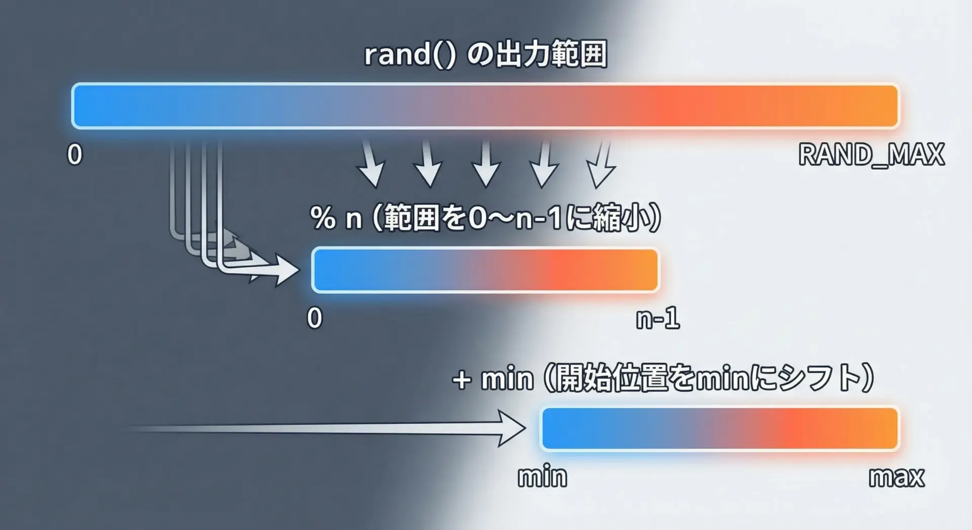 この式は、rand() % (max - min + 1)で0 〜 (max - min)の整数を作り、それにminを足すことでmin 〜 maxの範囲に移動させる仕組みになっています。