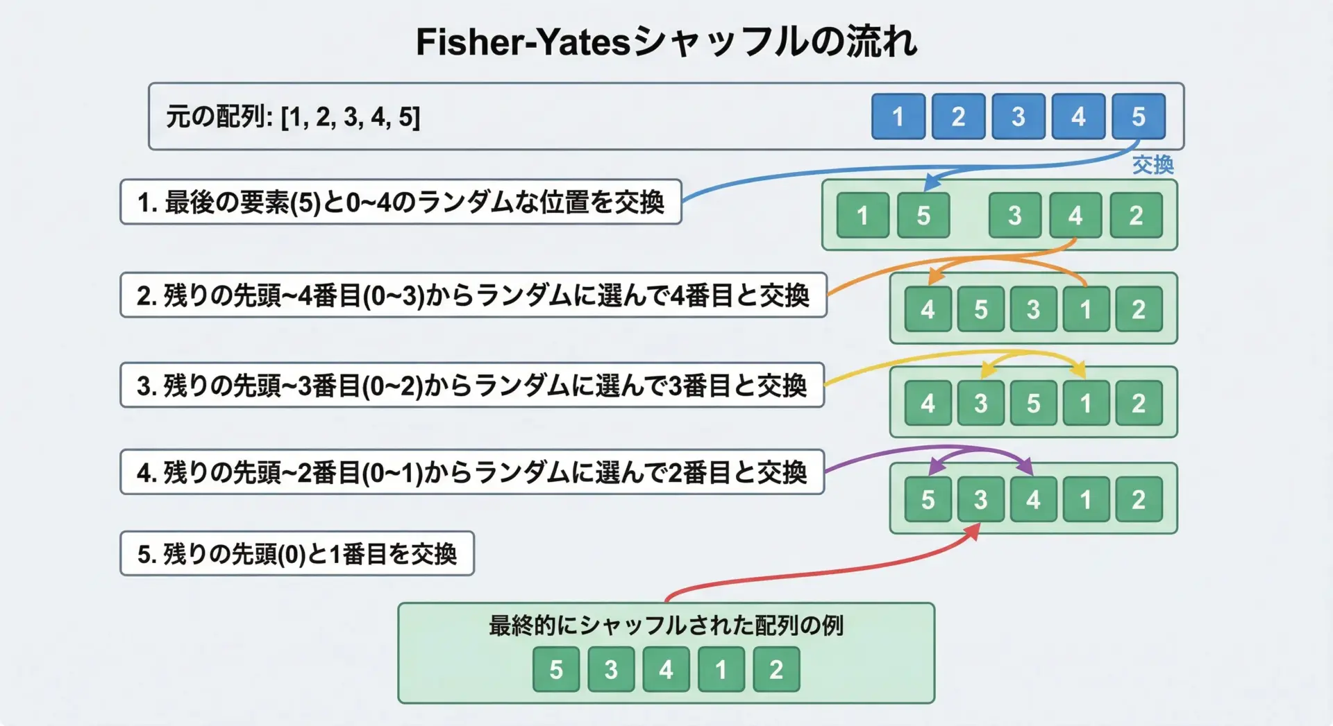Fisher-Yatesシャッフルは、正しい一様性を持つ代表的なシャッフルアルゴリズムです。