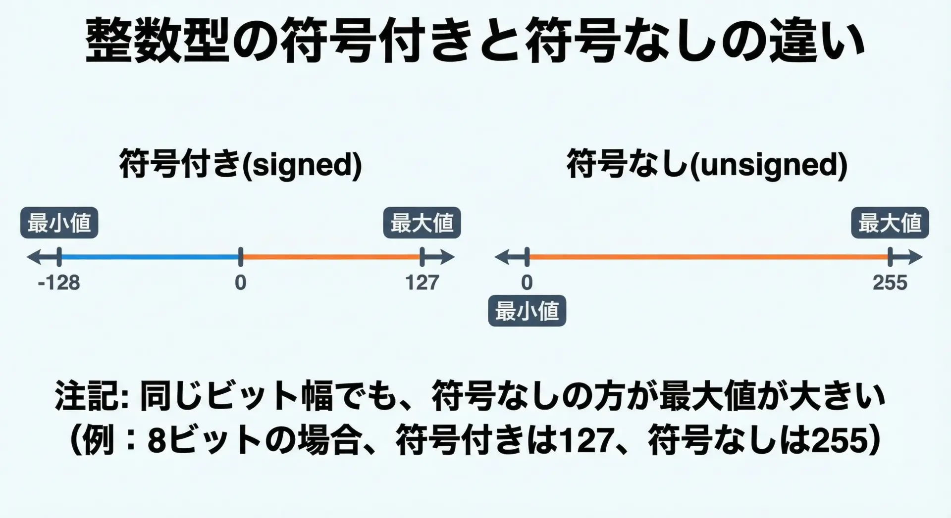 符号付きと符号なしの違いによって最大値・最小値は大きく変わります。
