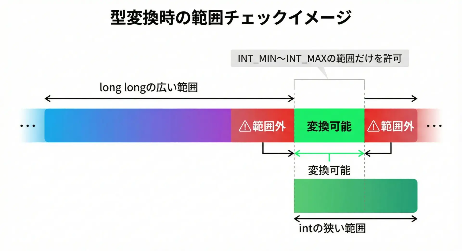 キャストの前にINT_MIN / INT_MAXで挟み込むようにチェックすることで、不正な型変換を防ぐことができます。