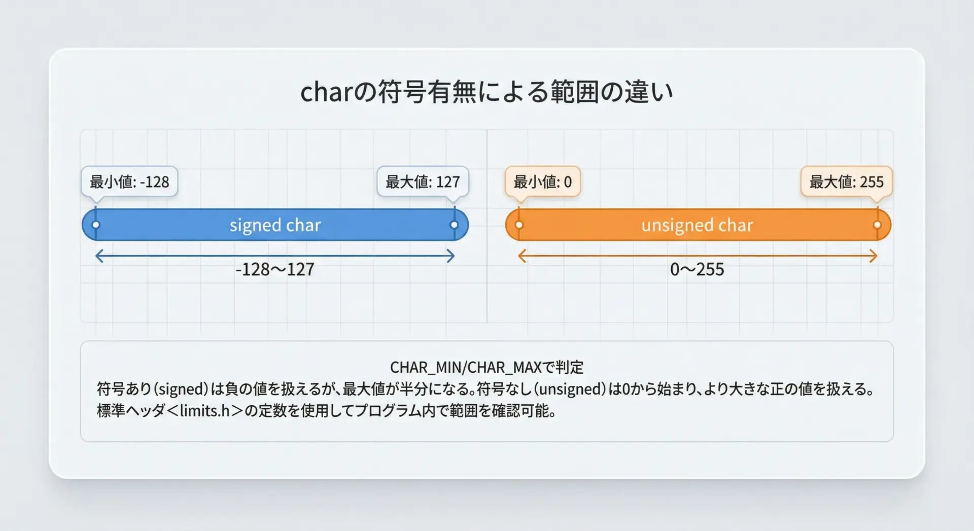 CHAR_MINは負の値(例:-128)、CHAR_MAXは正の値(例:127) - unsigned charの場合: