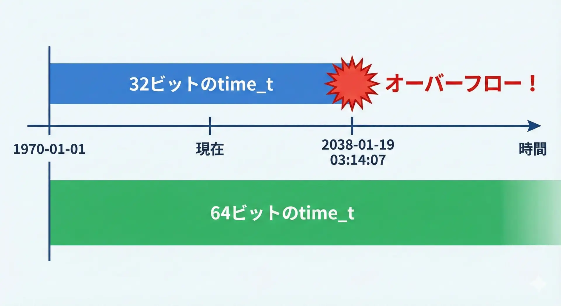 近年の64ビットOSやライブラリでは、time_tが64ビット化されていることが多く、2038年問題は緩和されていますが、古い環境との互換性を考えると依然として注意が必要です。