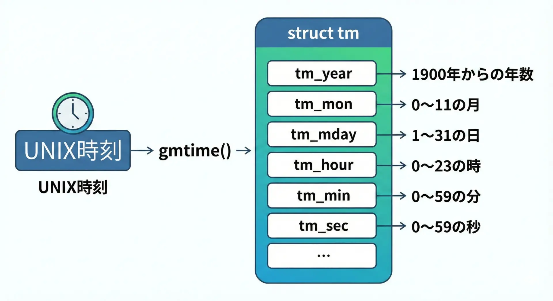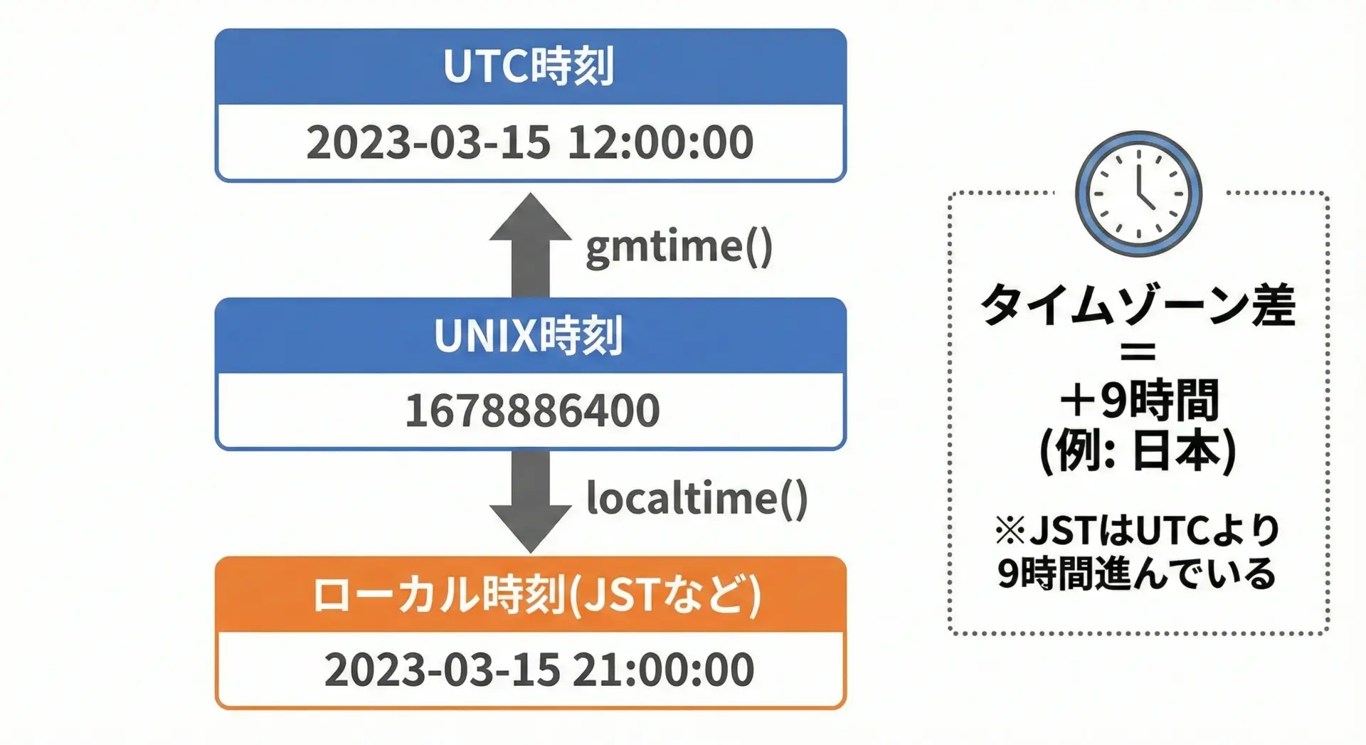 ここで重要なポイントは、gmtimeが返す日時は常にUTC(協定世界時)であり、ローカルタイムではないという点です。