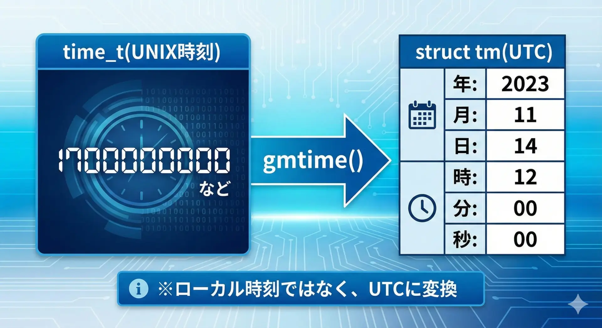 gmtimeは、UNIX時刻(time_t型)を「UTCの構造化された日付・時刻(struct tm)」に変換する標準Cライブラリ関数です。