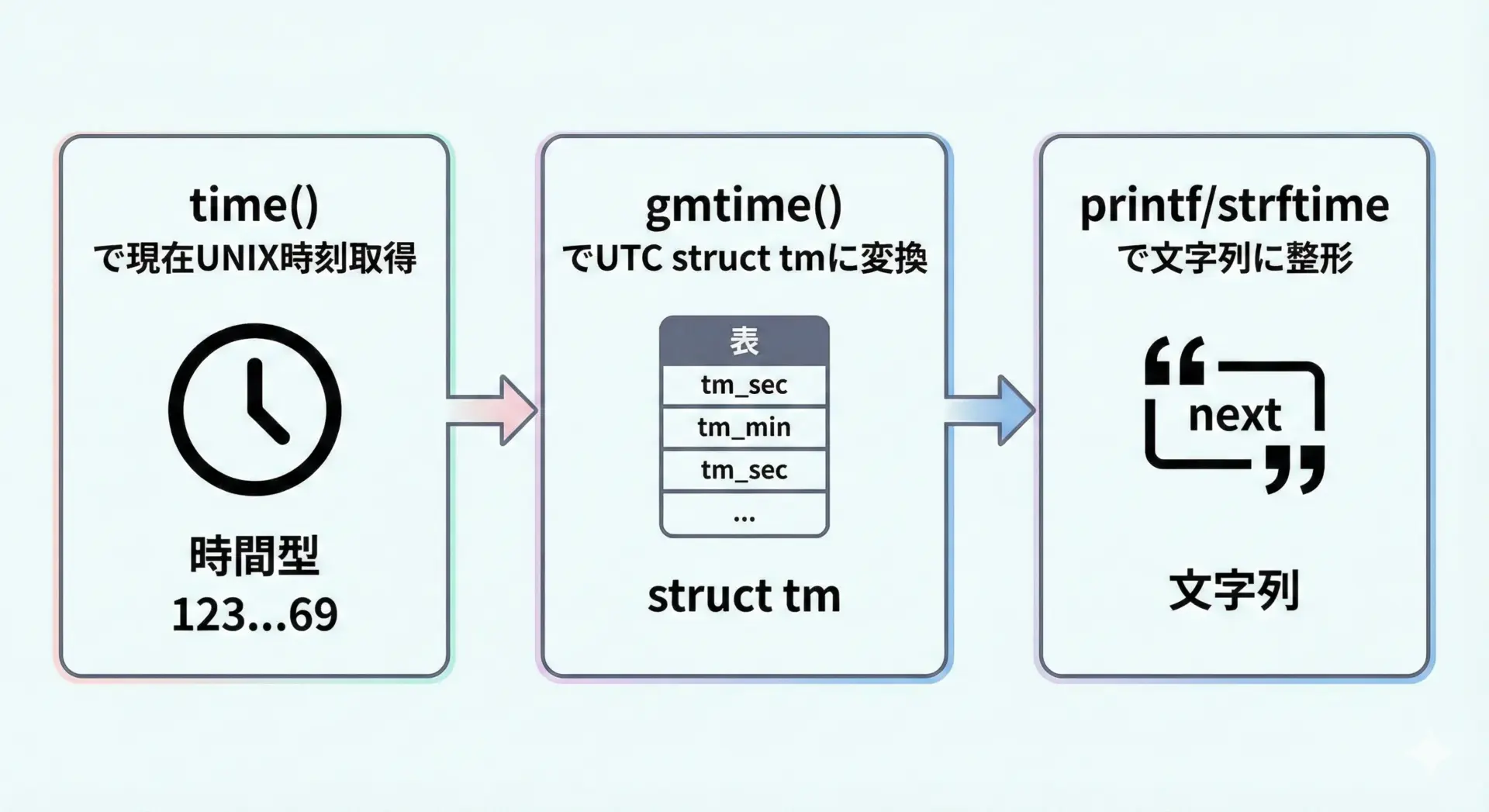 ここでは、現在時刻をUNIX時刻で取得し、gmtimeでUTCのstruct tmに変換する基本的なサンプルを示します。
