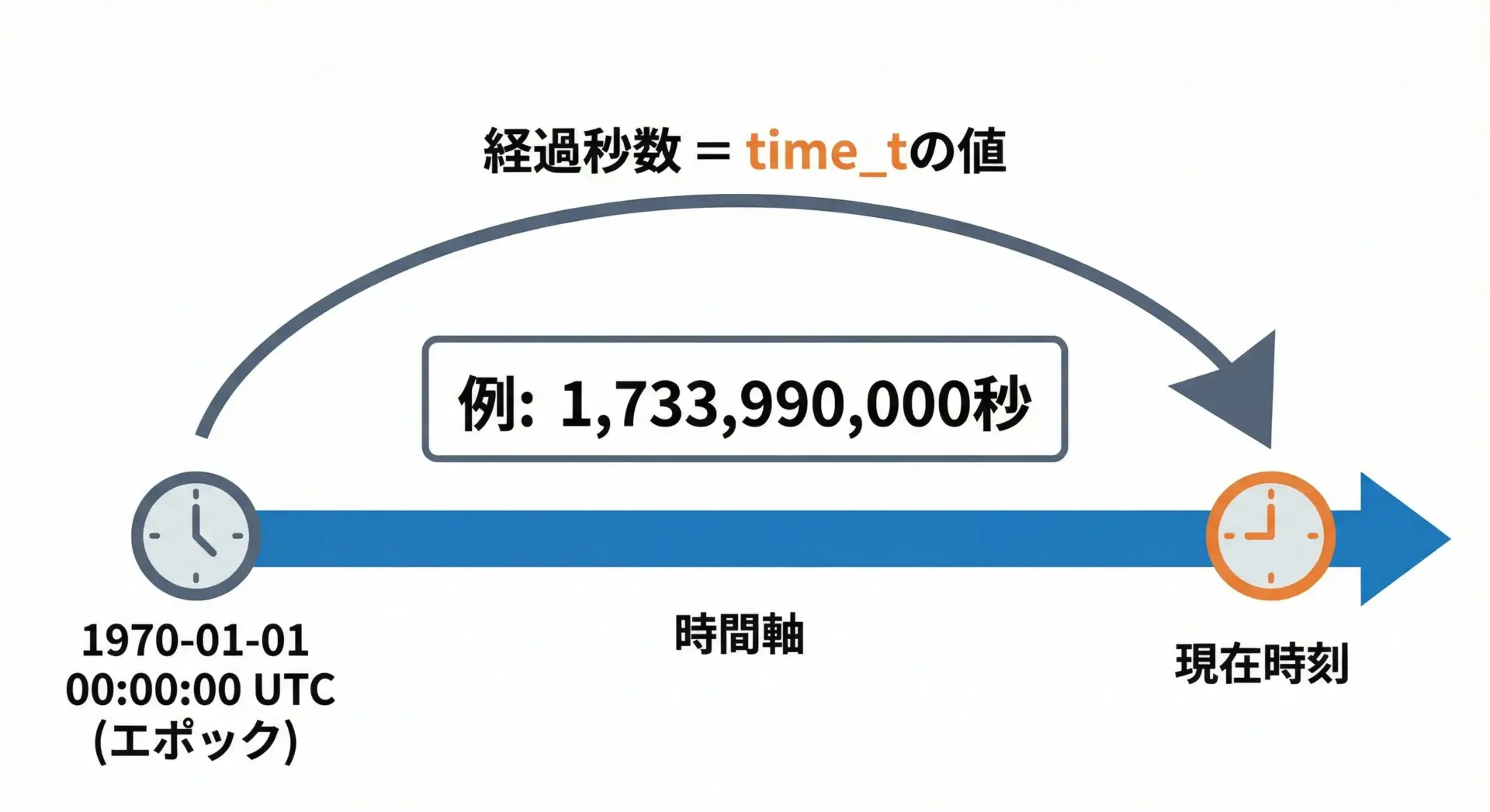 time_tは、エポック(epoch)と呼ばれる基準時刻からの経過時間(秒)を表す整数型です。