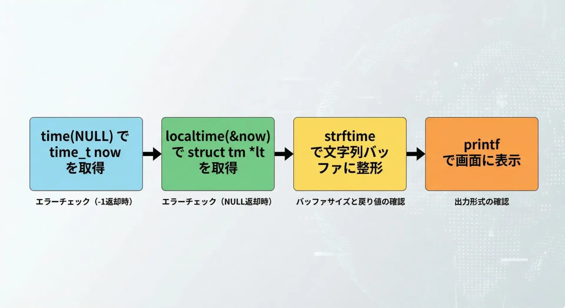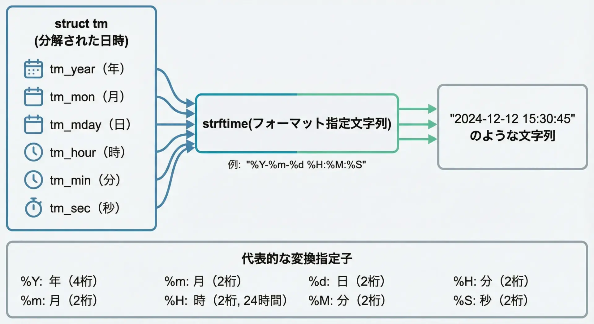この記事では、現在時刻の取得から、struct tmへの変換、そして任意フォーマットでの表示までを、図解とサンプルコードを交えながら丁寧に解説します。