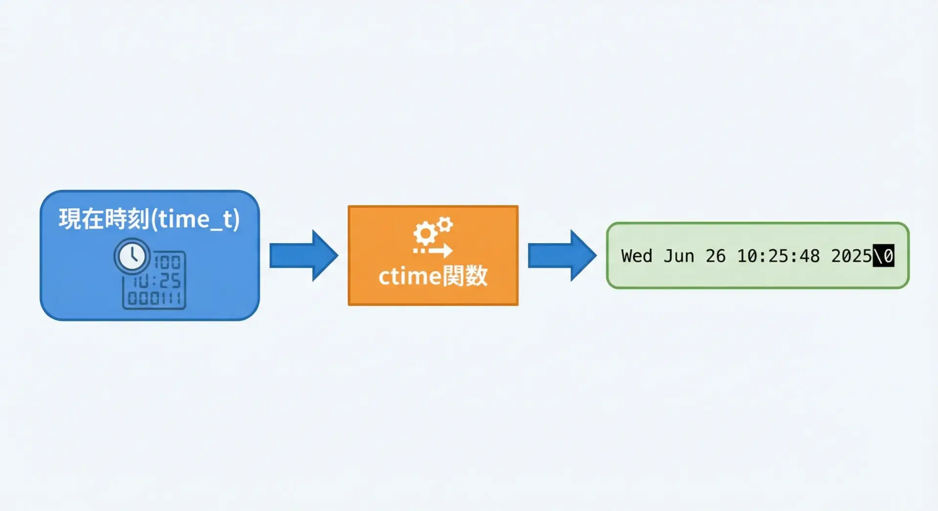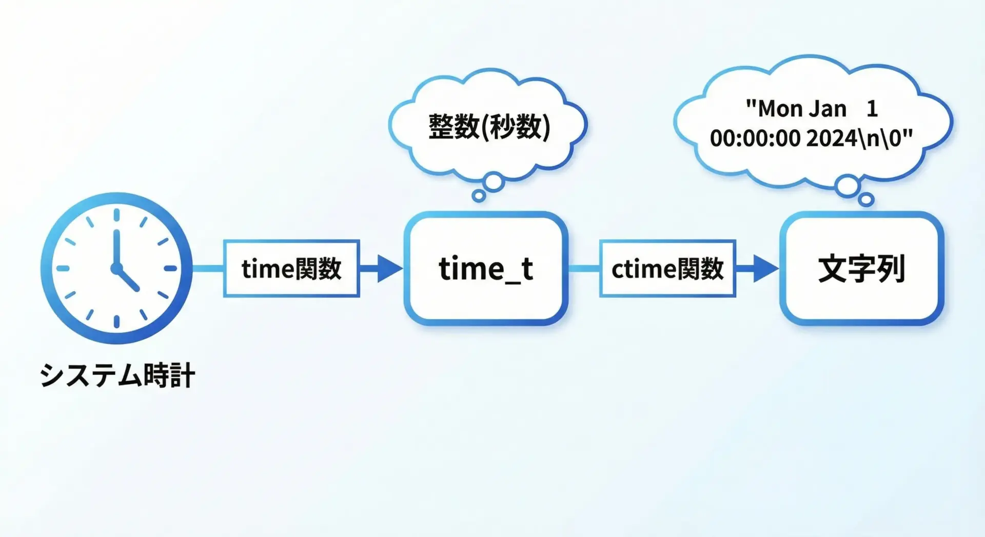 time関数が「現在時刻を表すtime_t値」を返すctime関数が「time_tを文字列に変換」する