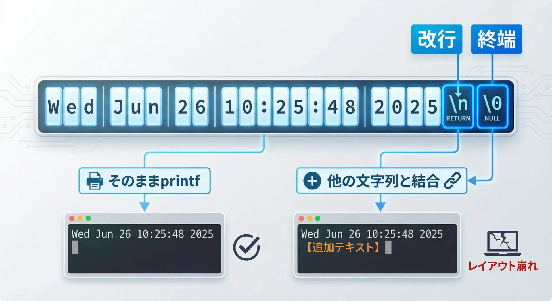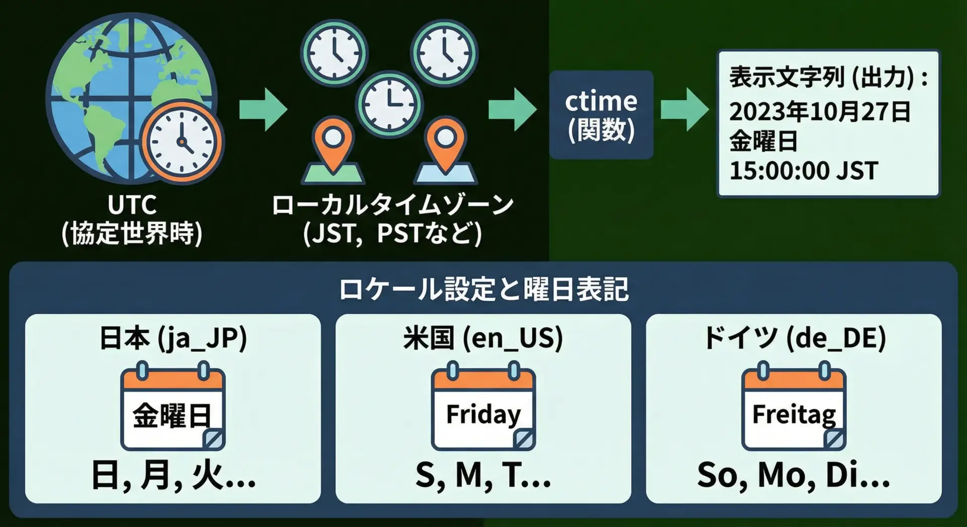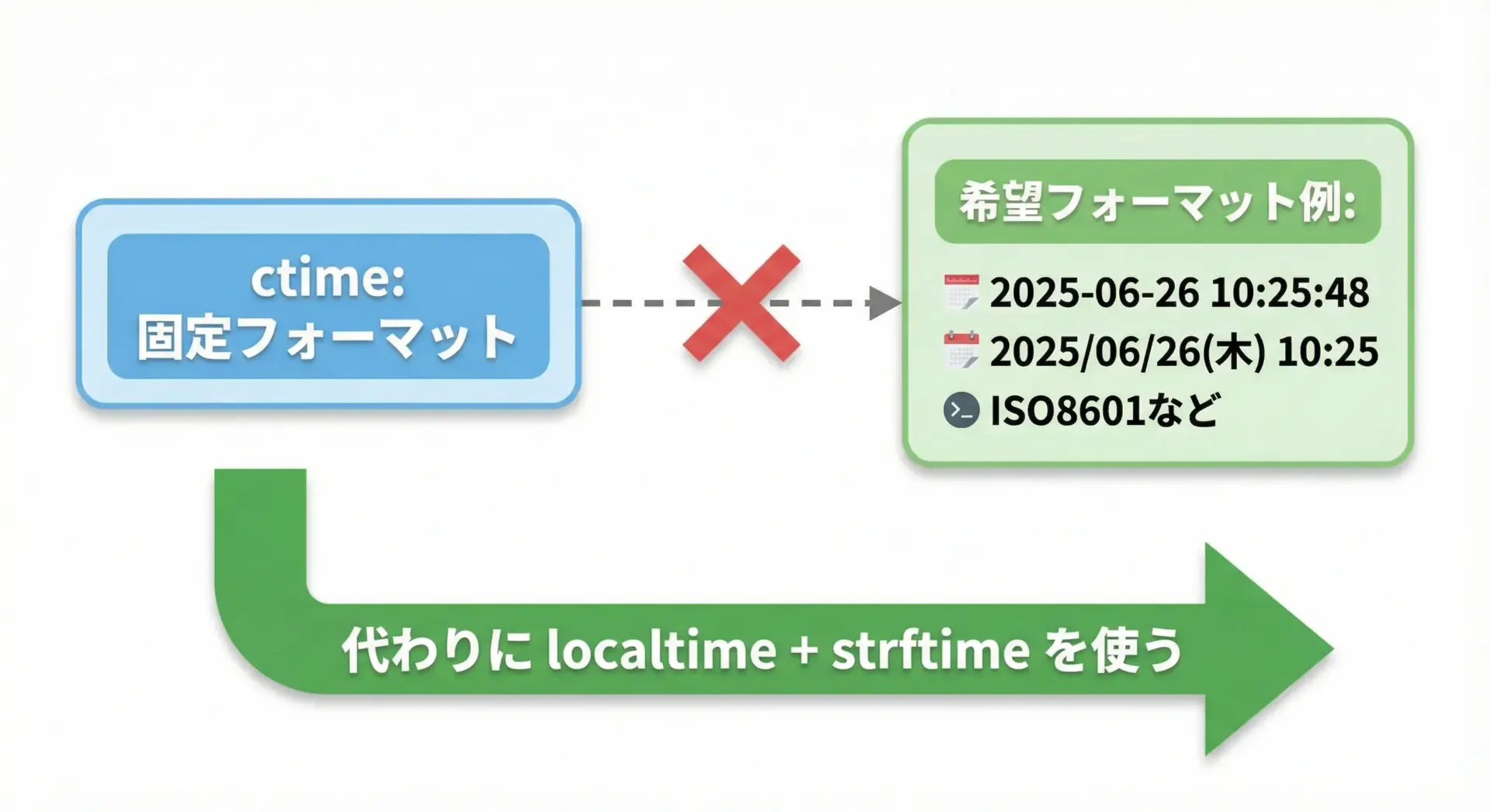 用途に応じて、ctimeを素早い確認用、strftimeを本格的な表示用として使い分けることで、安全かつ柔軟に日時を扱えるようになります。