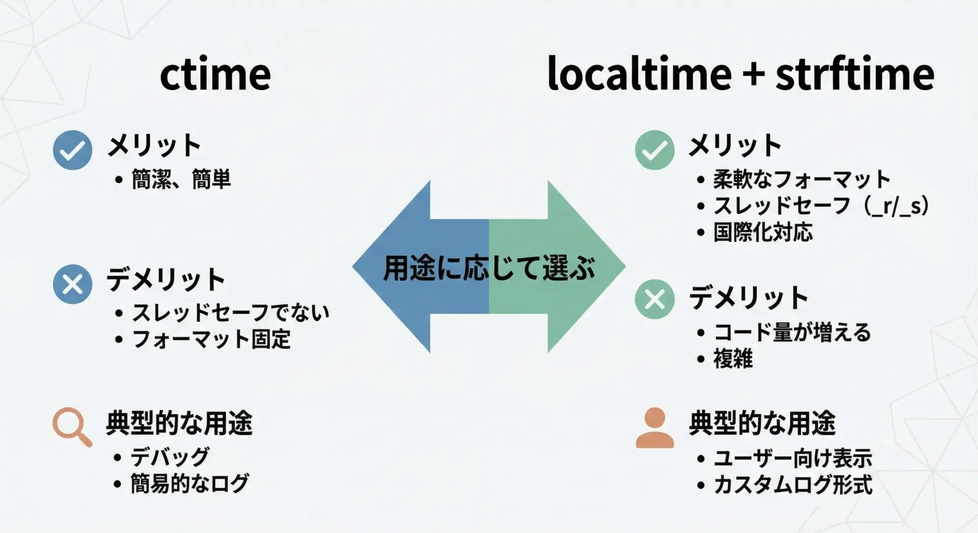 最後に、ctimeとstrftimeをどう使い分けるべきかを整理します。