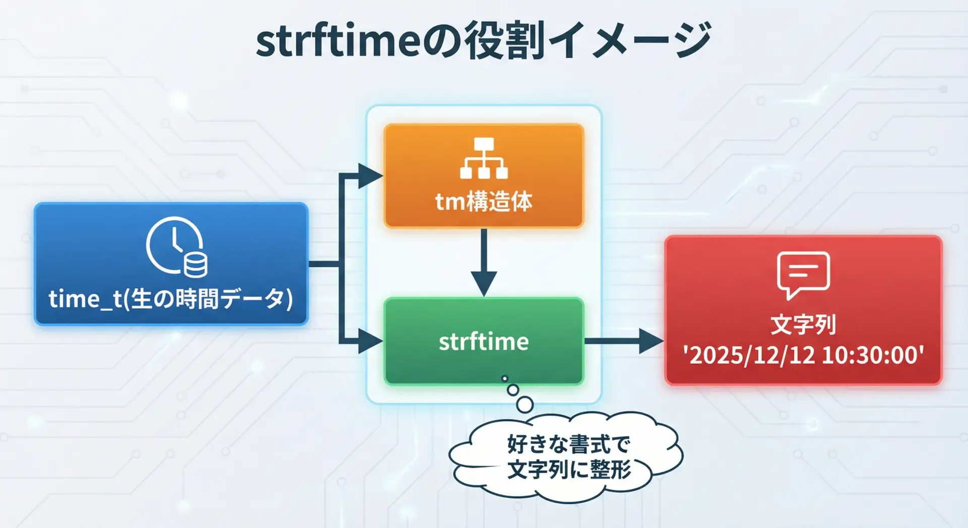 strftimeは、内部的に扱われる「機械向きの時間情報」を「人間が読みやすい文字列」に変換するための仕上げ役であり、特にログ出力や画面表示で頻繁に使用されます。