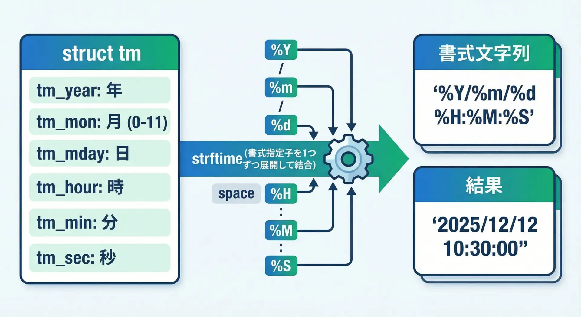 strftimeは、tm構造体から人間が読みやすい日付・時刻文字列を生成するための標準関数です。