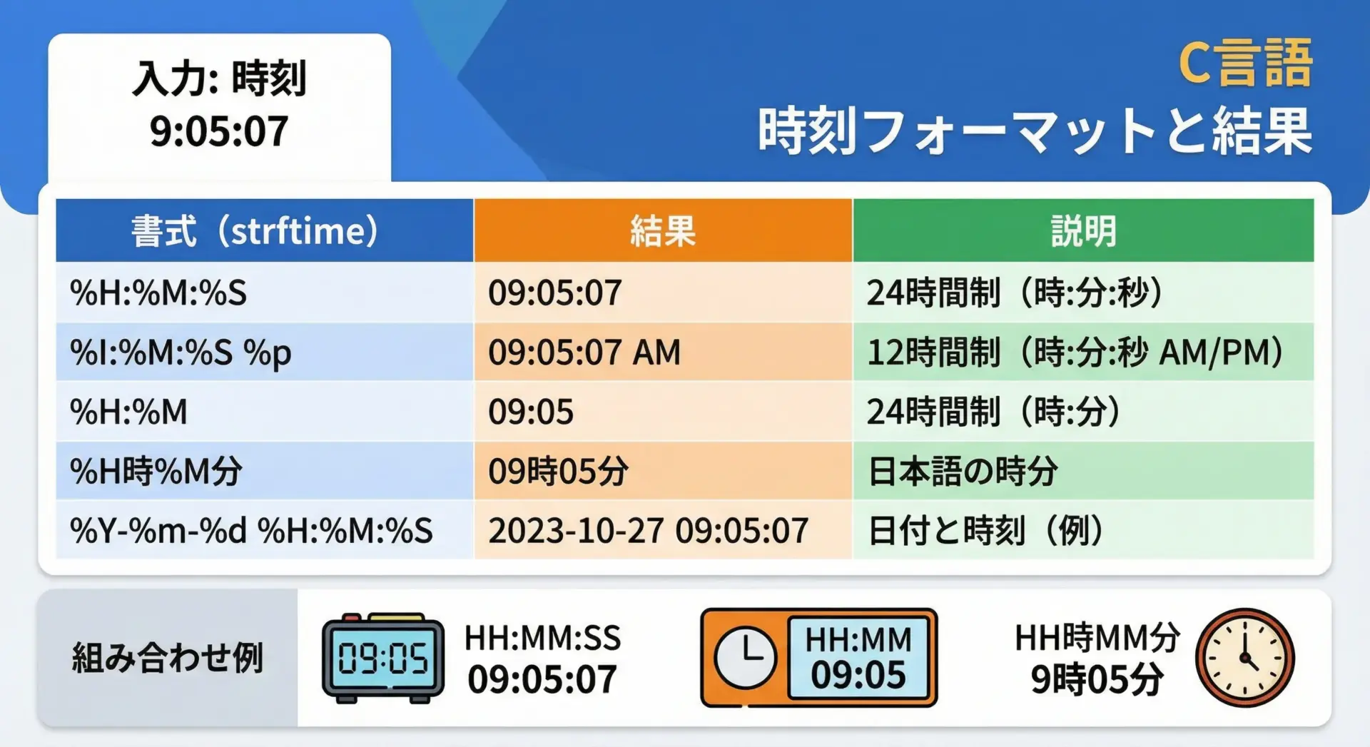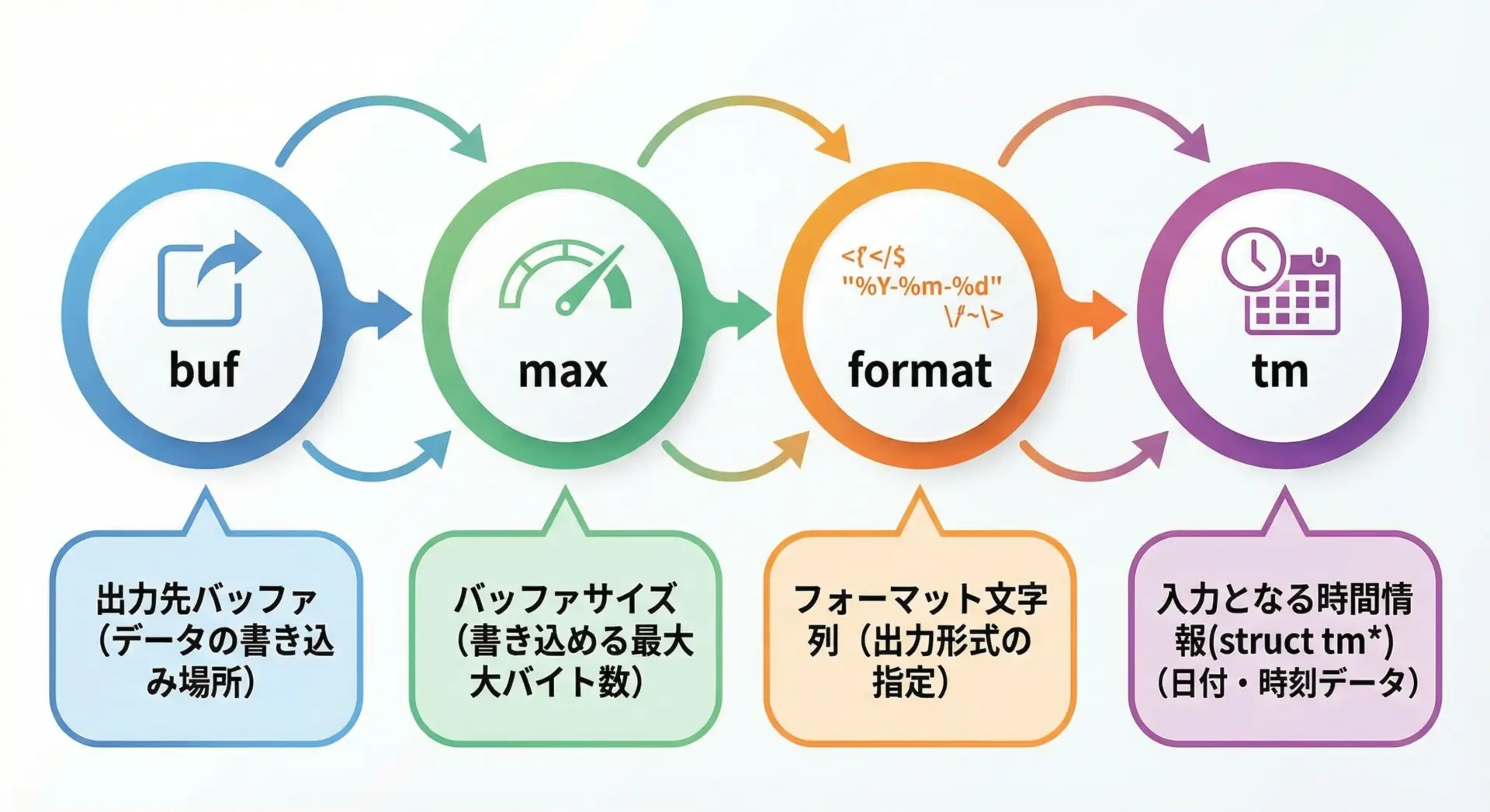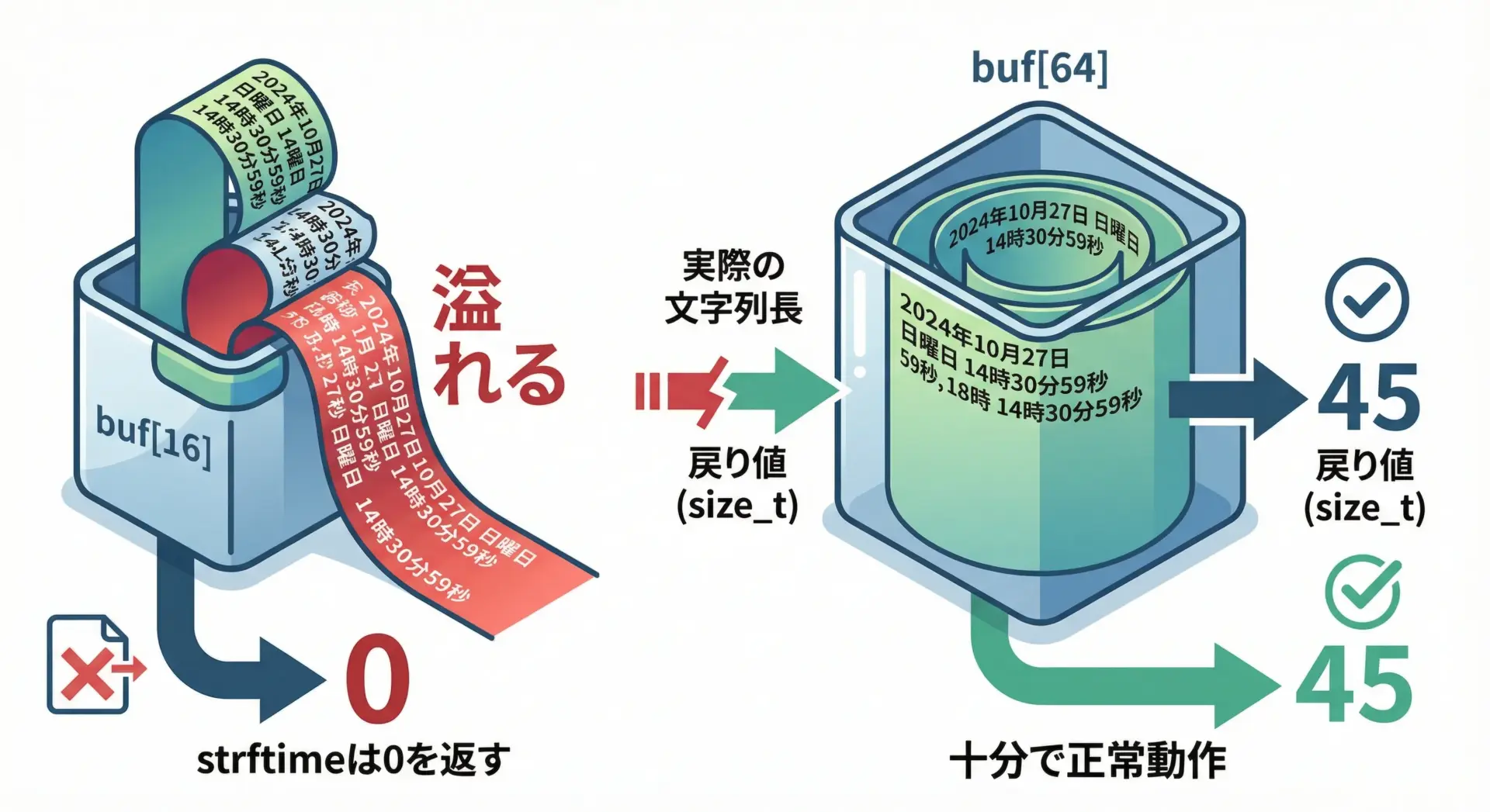strftimeは内部でバッファに結果を書き込むため、バッファサイズの指定や戻り値の確認が重要になります。