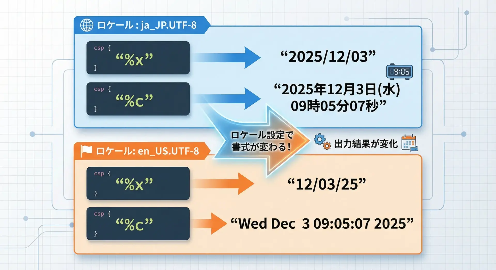 %xや%cなどのロケール依存書式は、人間向けの一時的な表示には便利ですが、ログフォーマットやファイル名などの「仕様」として固定する用途には向きません。