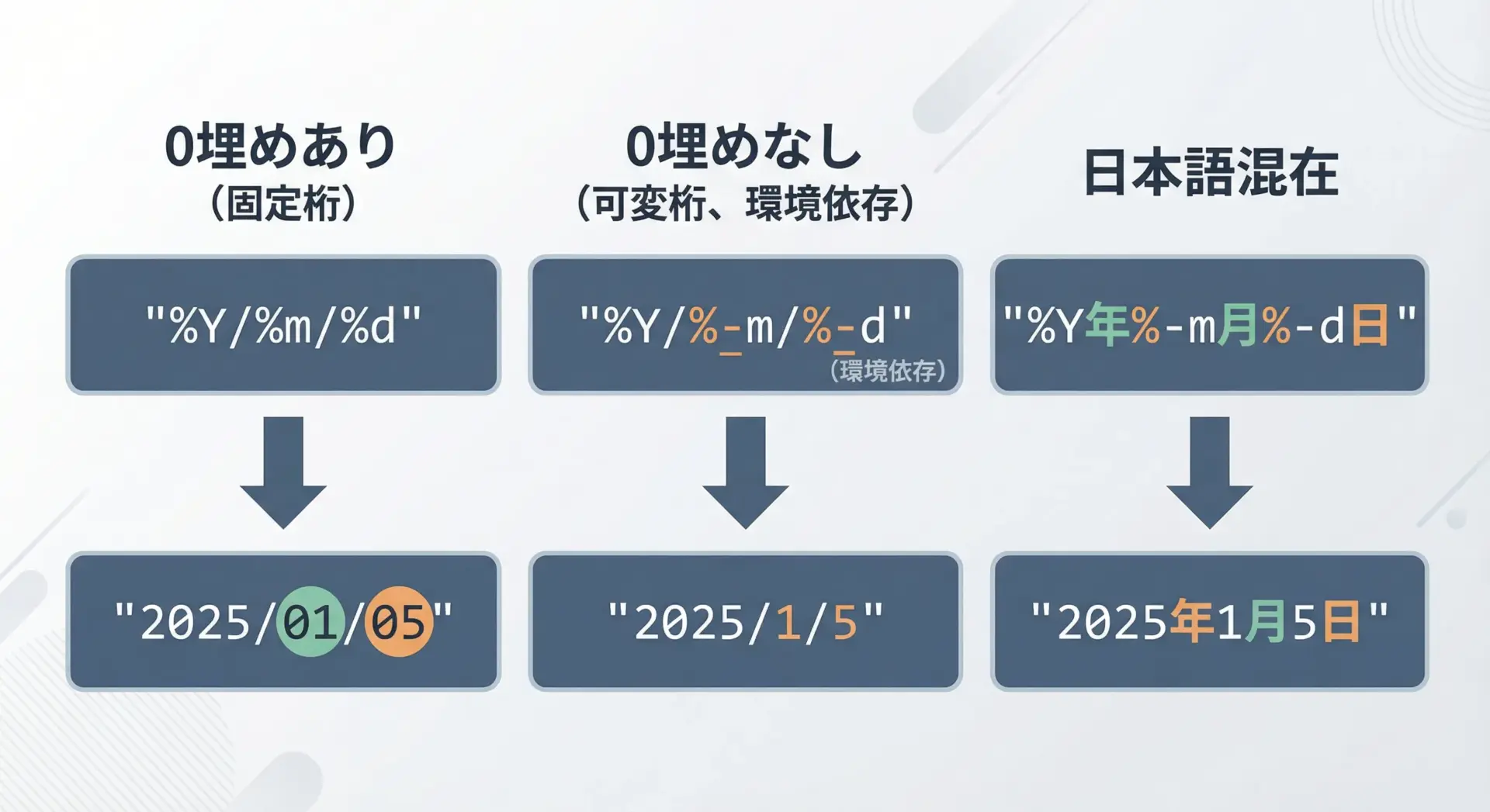 "%Y年%m月%d日"→"2025年01月05日""%Y年%-m月%-d日"→"2025年1月5日"(環境依存)