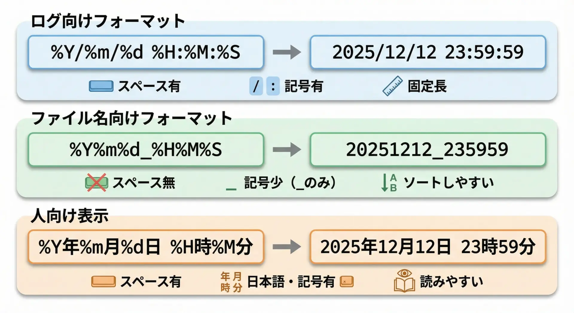 そのため、ログフォーマットやファイル名など、環境に依存せず一定の形式にしたい場合は、%Y, %m, %d, %H などの「固定フォーマット」を積極的に使うことが重要です。