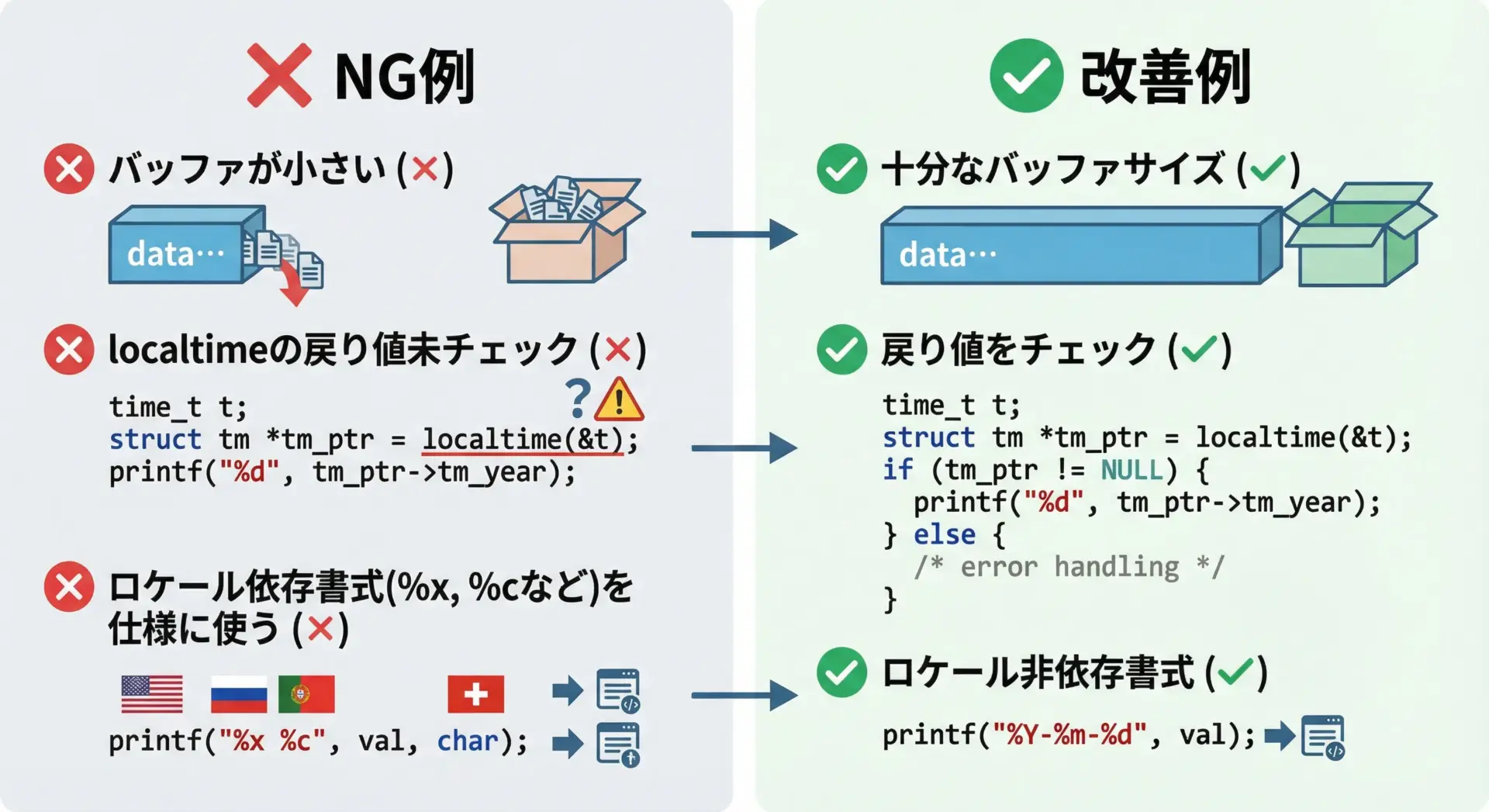strftimeを安全に使うには、バッファサイズと戻り値を正しく扱うことが非常に重要です。