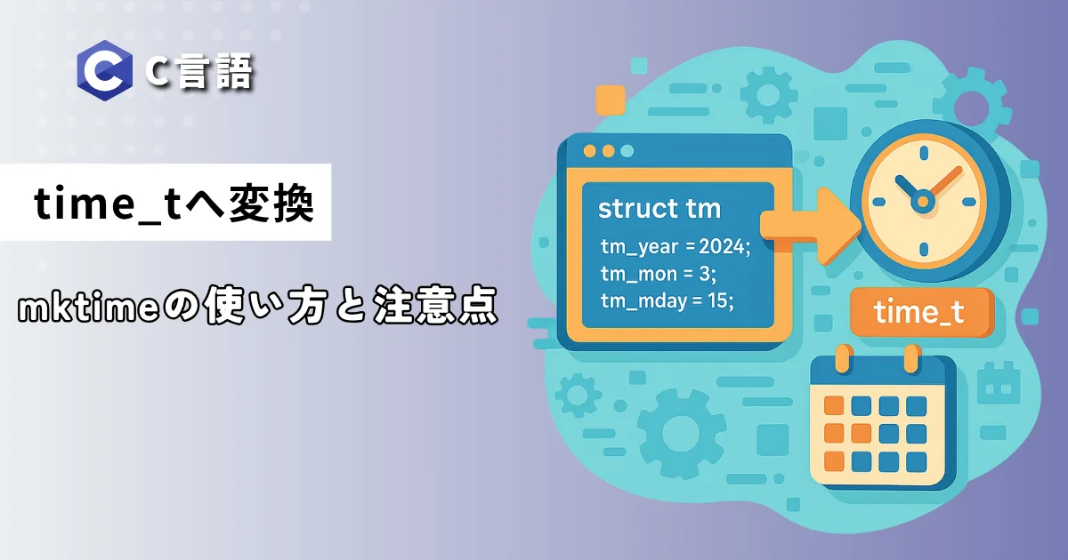 mktimeはstruct tm(ローカル時刻)をtime_t(UNIX時刻)へ確実に変換し、入力値を正規化してくれる中心的な関数です。
