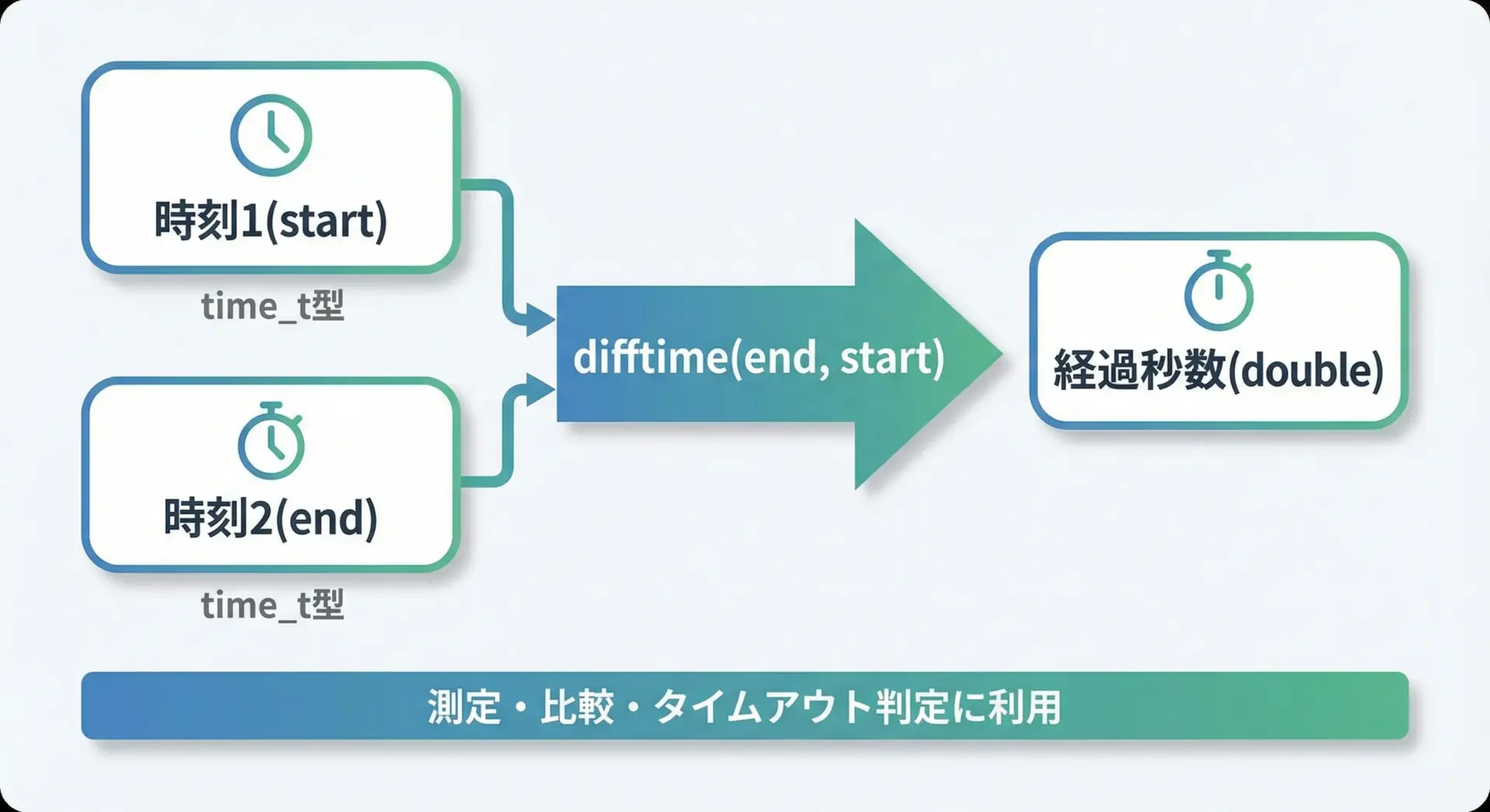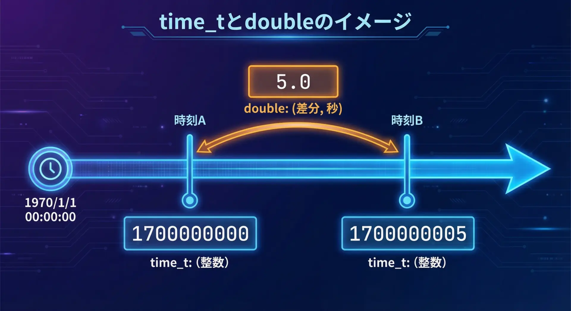 difftimeを使うことで、「time_tの実体が何であっても、秒単位の差分をdoubleで扱える」というポータビリティ上の利点が得られます。