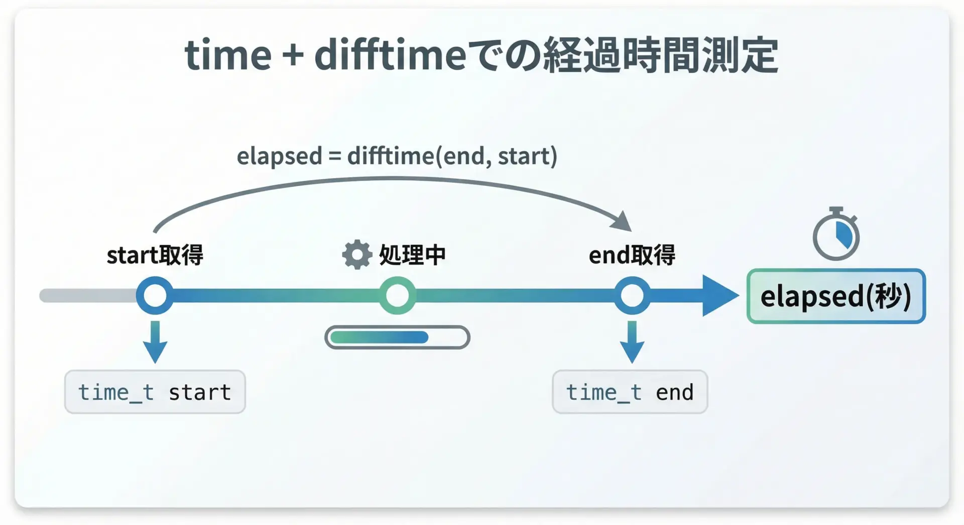 これらは標準Cの範囲を超えますが、「秒単位でよい簡易な計測はdifftime、より精密な計測はOS依存API」という使い分けを意識しておくと、設計段階で迷いにくくなります。