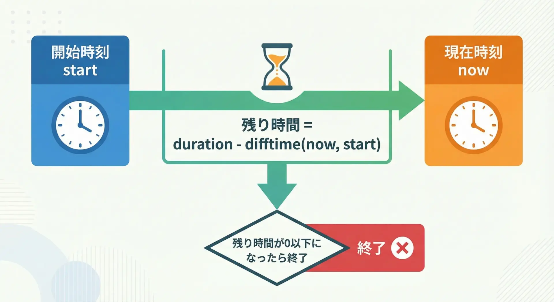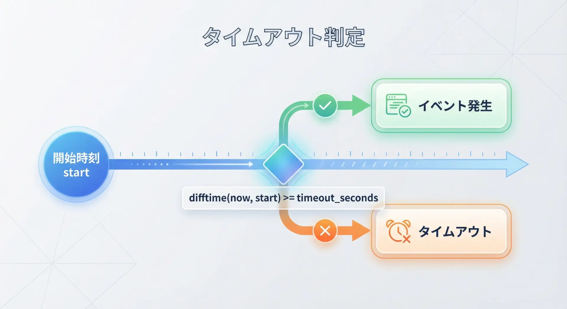 このように、「処理開始からの経過時間が一定値を超えたらタイムアウト」というロジックはdifftimeで簡潔に表現できます。