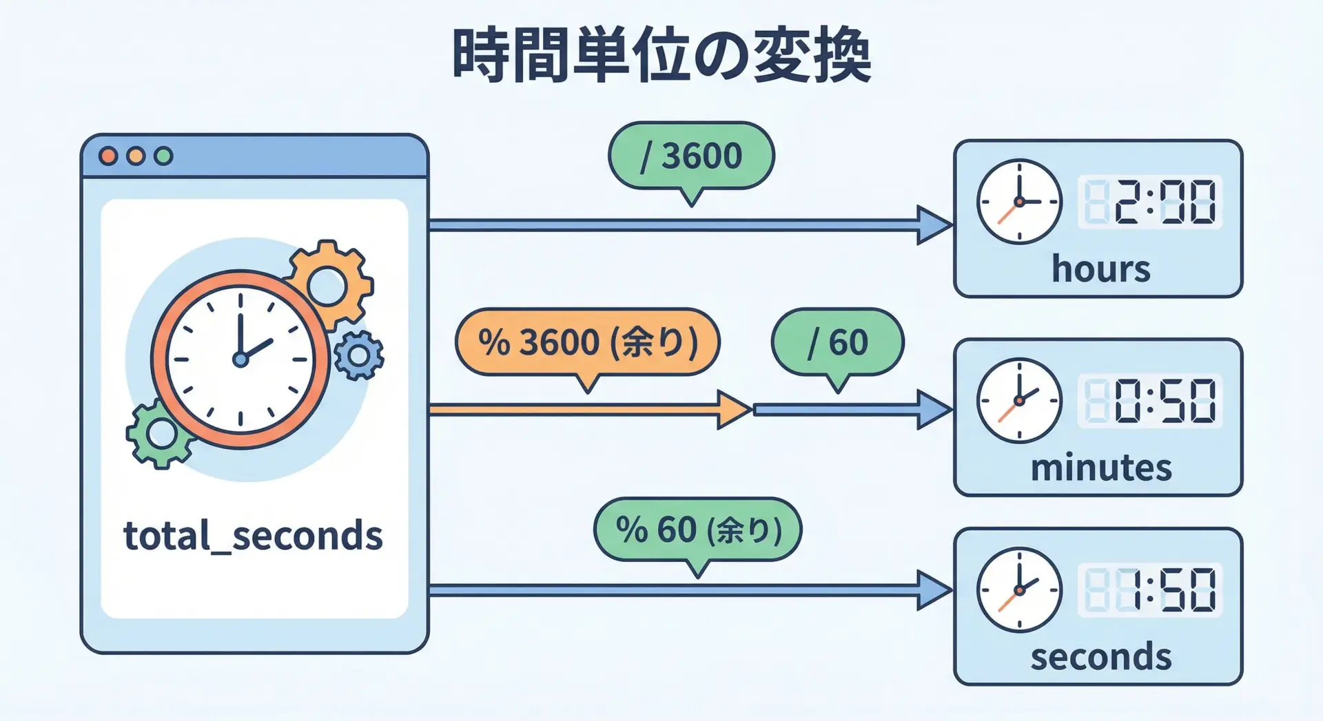 このように、秒→分→時間への変換は、3600(=60×60)や60で割ったり余りをとるだけで簡単に実現できます。